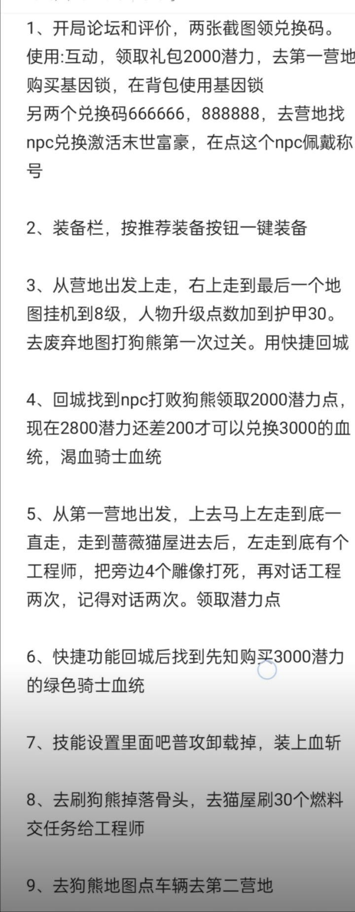1.开局论坛和评价.两张截图领兑换码。使用:互动,领取礼包2000潜力.去第一-营地购买基因锁,在背包使用基因锁 另两个兑换66666,6 88888去营地找npc兑换激活末世富豪,在点这个npc佩戴称 2.装备栏,按推荐装备按钮一键装备3. 从营地出发上走,右上走到最后一个地图挂机到8级,人物升级点数加到护甲30。去废弃地图打狗熊第一次过关。 用快捷回城 4、回城找到npc打败狗能领取20