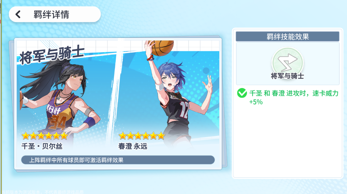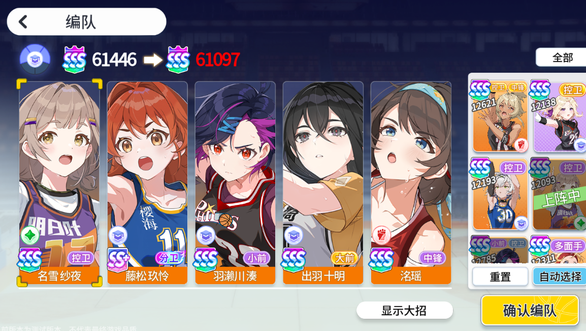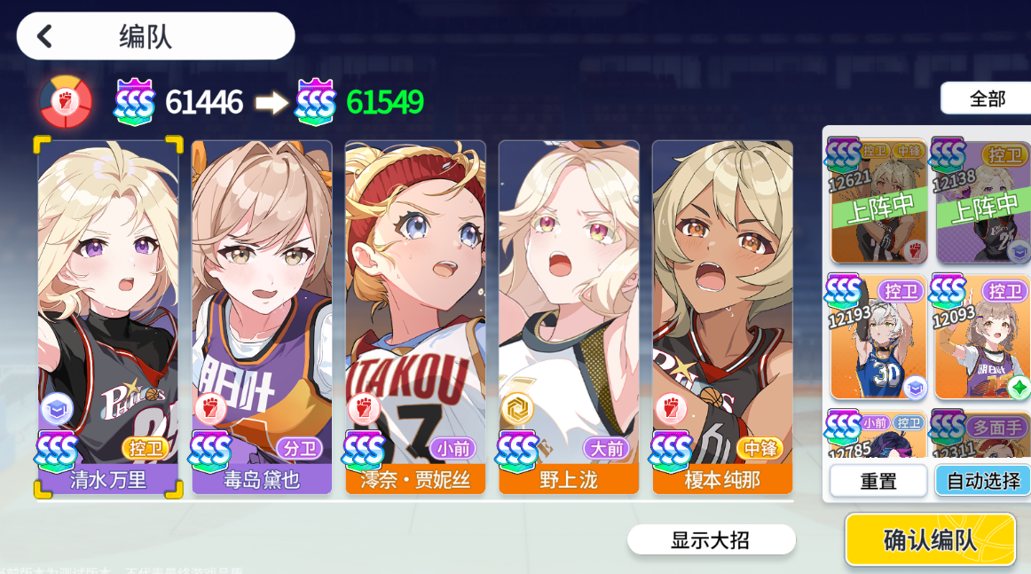 首先分位肯定是哈登控卫上有三个选择:第一个名雪全体回体能万金油神卡,第二个克拉丽丝开局自带80技能能量,开启技能全体提升投射三分钟,可以说是开局加到结束,因为三分钟足够技能回复能量第三个和泉,可以增加哈登或者望月大招能量也是张万金油卡小前选择望月,神卡,模拟无敌,可能会抢走哈登的技能增幅,因为回蓝技能是给得分最高的增加,望月模拟下是一球不丢的,所以必须给哈登带开局持球狂热快速得分大前上有三