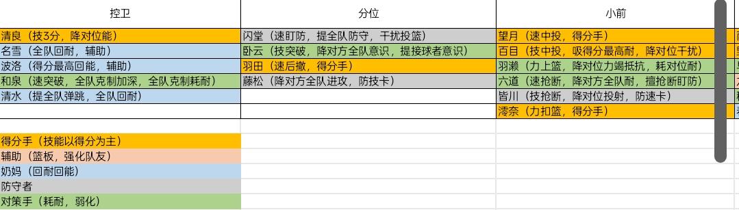 列出了每个位置上的常用球员的特点,以及做了一个相对简单的分类,可能没那么严谨,毕竟有些球员相对全面,可以同时划进两种分类里。希望本表能便于大伙对培训球员的选择,以及启发大伙的组队思路