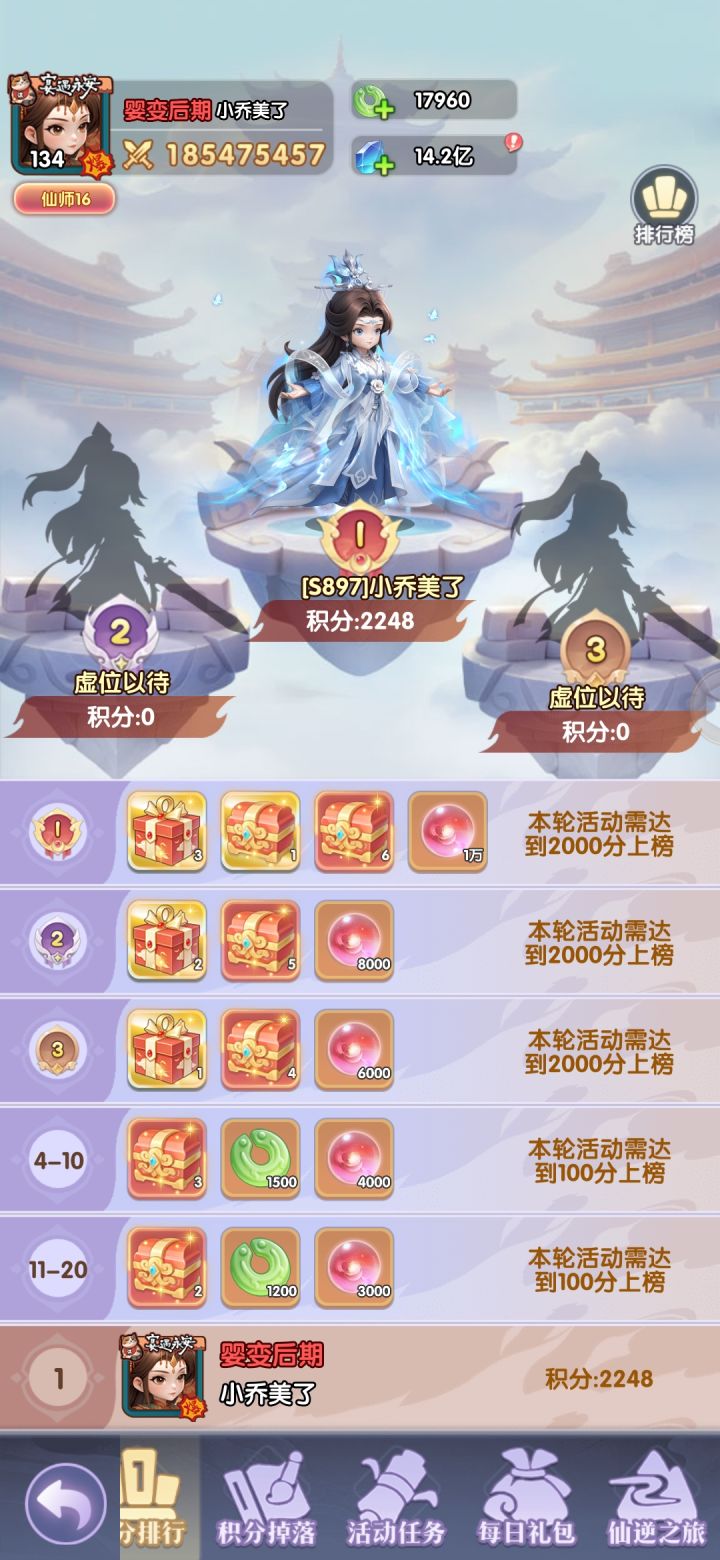 1.仙逆之旅来了,要氪的就氪68+128=196,战令礼包2.前期囤材料的玩家,材料不要一次用完,留一半最后一天看积分排名,计算好积分在抢榜。(如果遇到大佬全拉满抢前三难,就不要浪费材料,能进前三就抢。)3.我是留了一半材料等活动最后一天抢榜,大家也不要一次用完。材料任务页拉满是(2940分)下次活动是半个月。