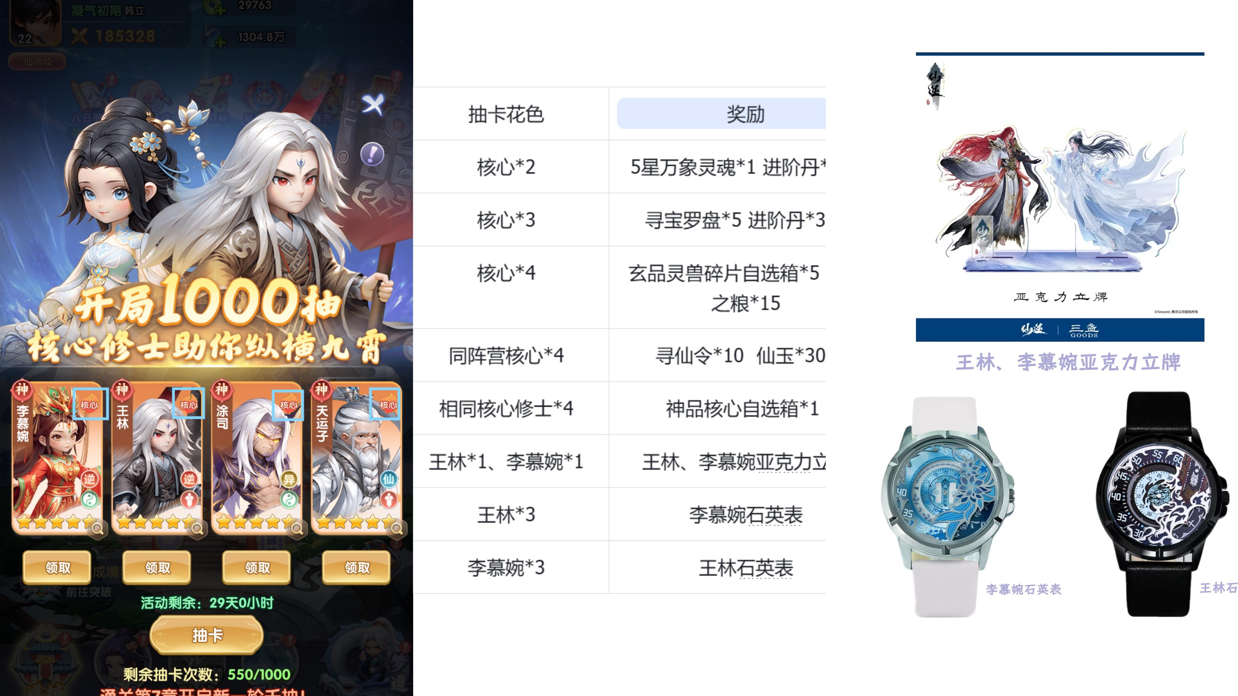 刚看到了千抽欧皇活动,下周二开始了,关于千抽分享点自己的经验。大家可以去试,我是看上了千抽王林,李沐婉对应的纪念款手表,大家可以通过这方式,刷千抽开局。1.起号:进入游戏,快速到9级,点开灵石,捐献13次,然后点开新服活动,领取灵石捐献奖励,然后升级黄龙真人和进阶。阵容布阵,就凤鸾1号位,黄龙真人2号位。这样可以攻击追击最大化,快速到4-3,第一个千抽,这个时间起号时间6分钟。2.抽卡出核心几