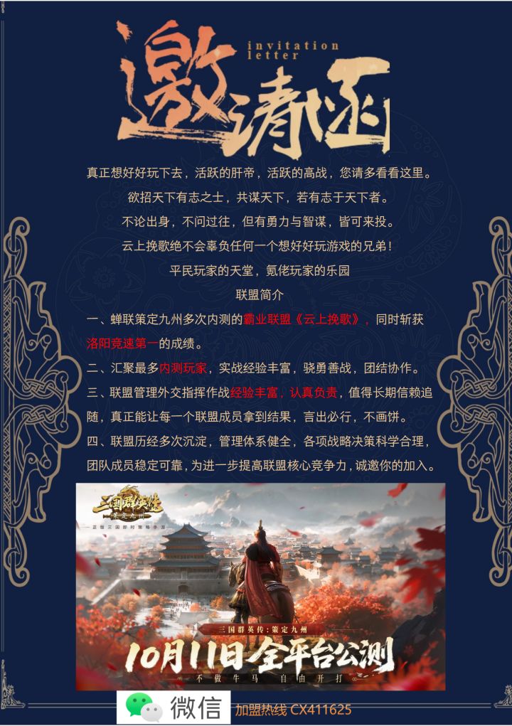 江左盟汉祚倾颓,奸臣窃命。江左群英,举义旗,清君侧。戮力同心,共扶汉鼎。凡我同盟,歃血为誓,讨逆除凶,誓安社稷!江左盟告天下。三谋老盟主带队,一起的➕➕
