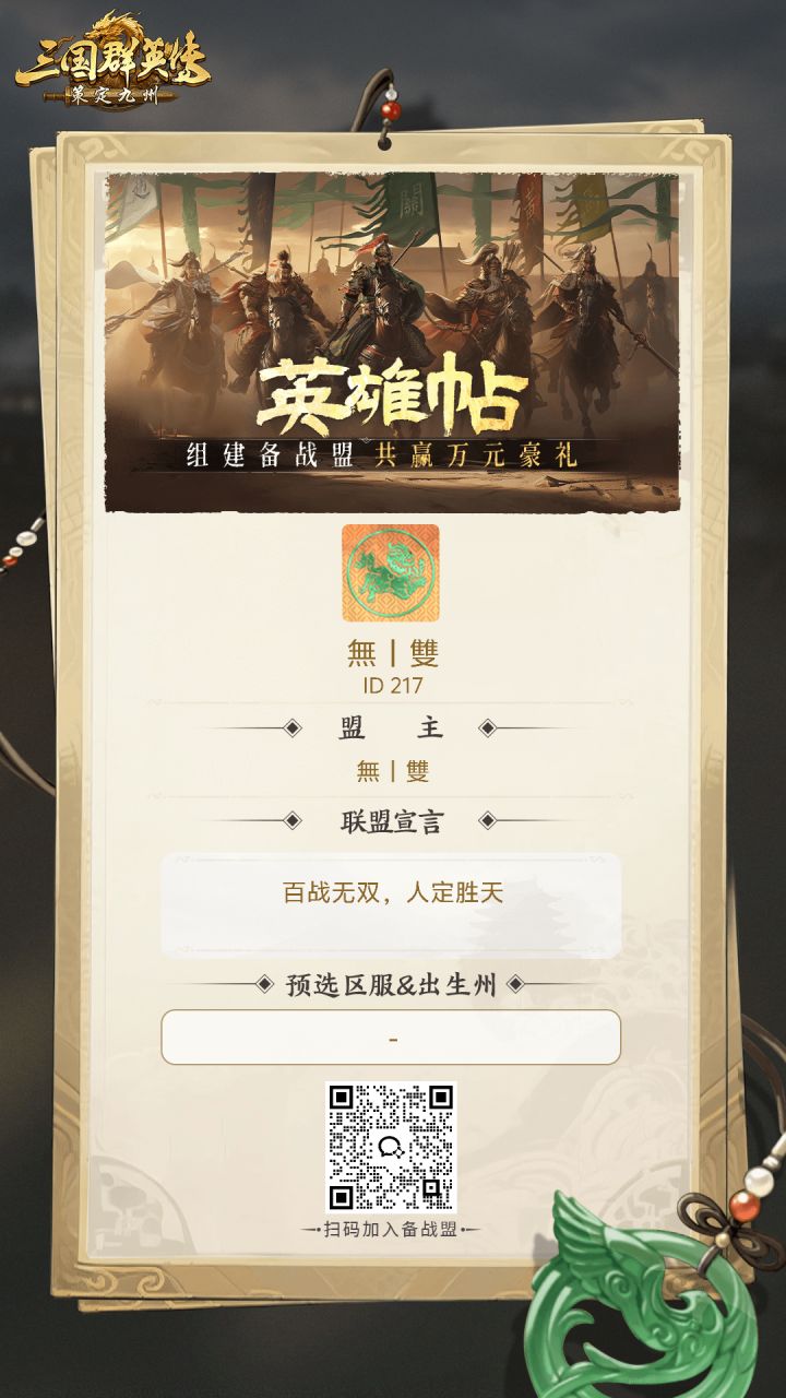 9月15号不付费删档测试,想体验的兄弟扫描二维码进群一起公会福利:落地带马甲报销首充 每周战功榜前三月卡 战力冲榜前十128 前三328 管理每月报销双月卡 我们有全方位无死角的专业老玩家教学,帮助每一位新手快速成为游戏大神。 我们有专业指挥专业管理,让每一位成员都能体验到战场冲锋的乐趣。 欢迎每一位兄弟加入我们。#三国群英传策定九州