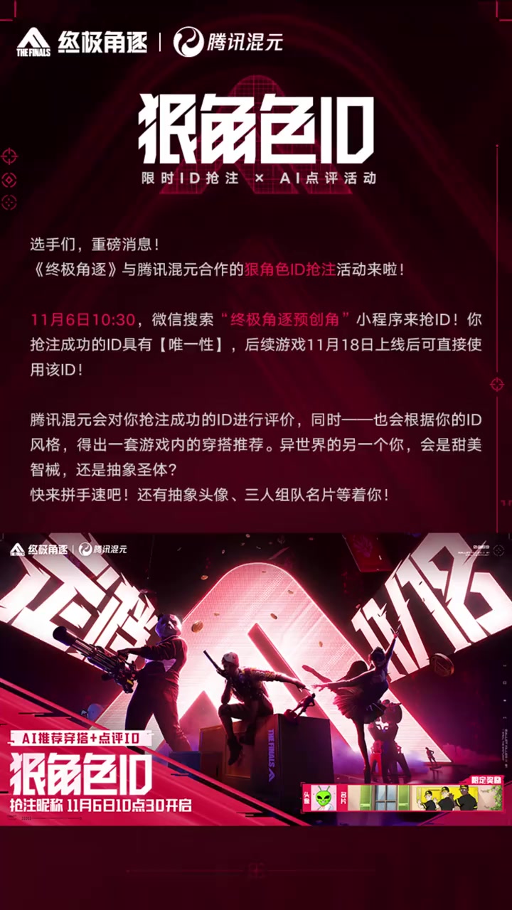 由虚幻引擎打造的全场景破坏秀场,搭配极致美术打造视听盛宴,静候各位选手,大展身手!3天后,你第一个想用的选手体型是谁?快来和角宝分享吧!#thefinals国服 #终极角逐上场即炸场 #终极角逐定档11月18日