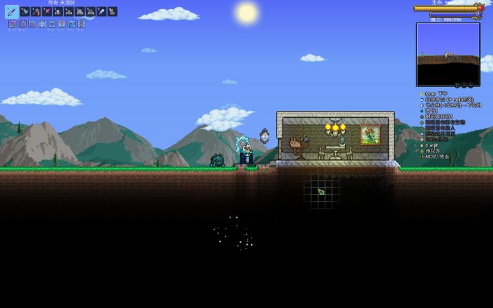 1.快捷栏,想使用物品必须打开背包把物品放到快捷栏上,可用数字键切换(打开背包按ECS键) 2.生命值,初始100,在地底可发现水晶之心,用锤子敲后可得到生命水晶,使用后增加HP上限20,最多到400 3.树木,砍伐后可得到木材和橡树种子(种子用于种植树木),使用斧头才能砍伐(上图快捷栏3) 4.太阳(月亮)太阳可以代表大致时间,在白天会有史莱姆一类怪物(正常区域),夜晚会在附近生成怪物(僵
