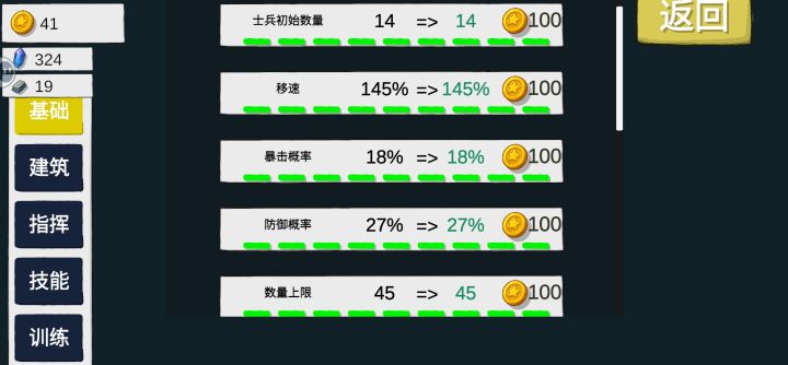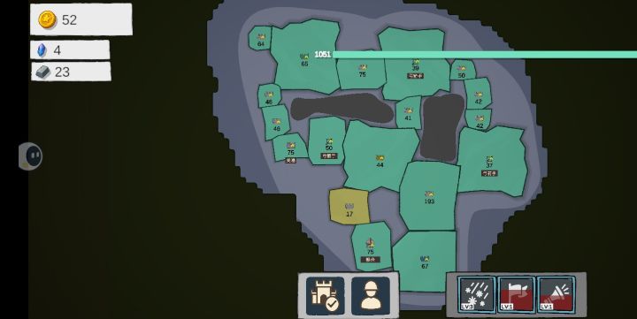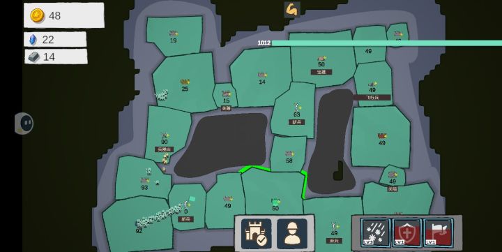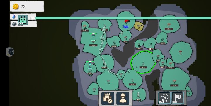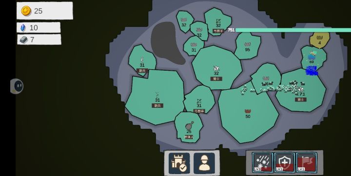 在更新的53个关卡里,如果想要不升级通关,最难的基本上就是第31关,我方初始兵力5,敌方15,并且敌方招募速度还更快。 但人机的套路基本类似,开局就会去占5人的小城,因此我方开局需先避其锋芒,往右下角发育,重点利用弓箭手的射程削弱兵力差,后续则是等敌方出兵去远处时,抓紧时间占领敌方人数少的城。 当然通过这关也需要运气成分,需要多次重开。至于有多个敌人的关卡,先坐山观虎斗,猥琐发育。如果开局位置被多