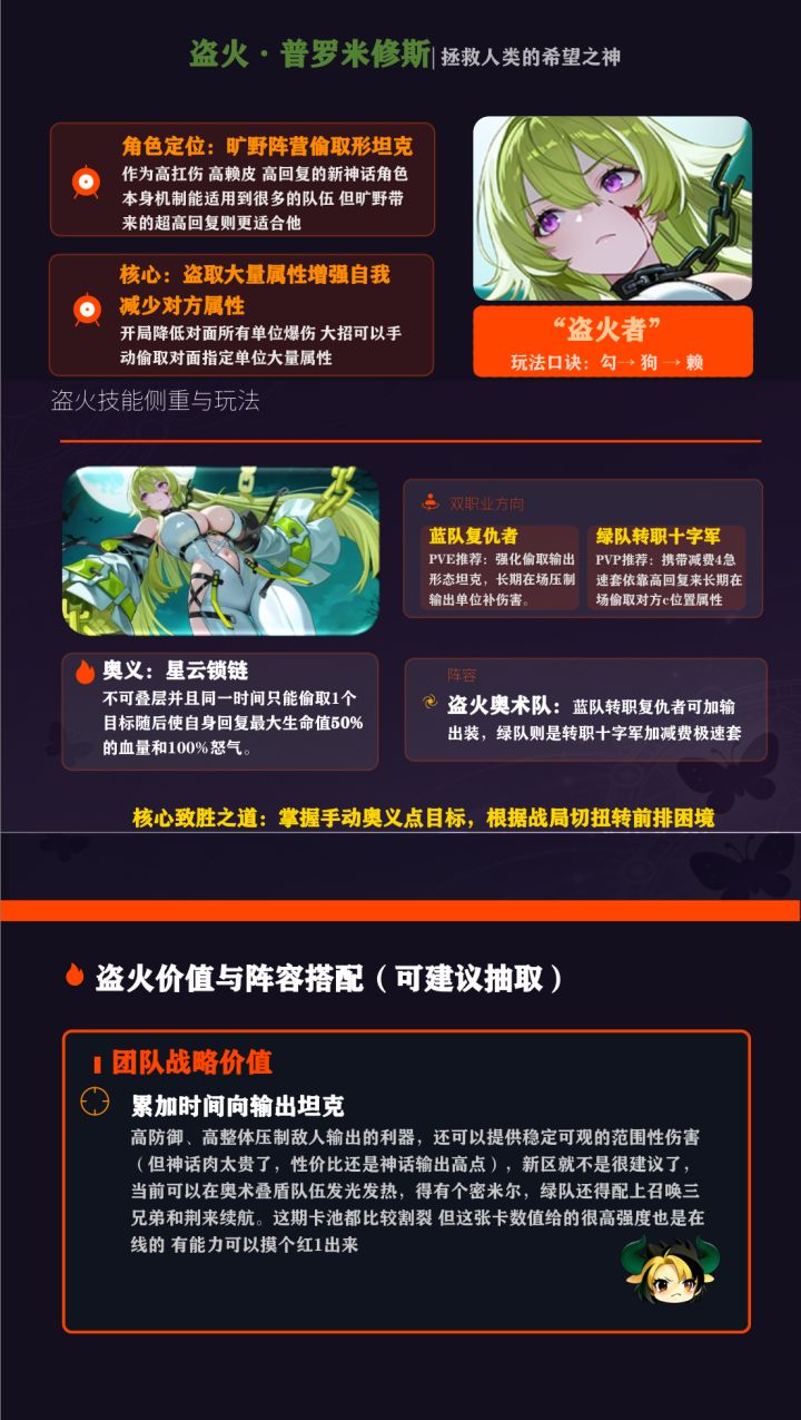 礼包码:LOCKONU「盗火之神·普罗米修斯」现已登场!把火给予人间,把温柔留给你!普罗米修斯大人终于登场详细攻略及配队思路请拿好↓↓↓技能解析与装备推荐你想要的技能都给你偷来>>技能解析与阵容搭配<<旷野/奥术双阵营神话守卫,以独特的属性偷取与暴伤压制为核心机制,能大幅削弱敌方核心单位的同时可强化自身,是兼具团队防护与单体针对能力的顶级前排。天赋【缚象化解】能直接降低敌方全体暴