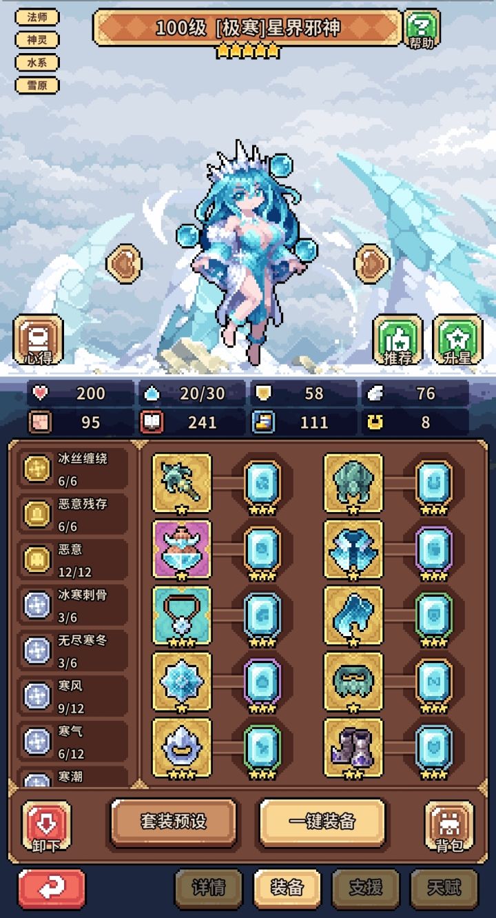 先叠个甲,本帖不算严格意义上的冰邪攻略,因为远远没达到冰邪的上限,只能算分享低成本快速成型通关心得。一镜到底通关,证明不需要凹怪。天赋、装备和支援视频里都有展示。【补充说明:介于很多人高估五星异化狩猎勇士的重要性,虽然我明确表示2星就够用,但事实胜于雄辩,所以特意用国际服零氪的号录了个更低配置的通关视频。】我的龙女第一页天赋开了,所以切到第二页,不生效第一页的天赋。异化恶魔要的是她魔族种