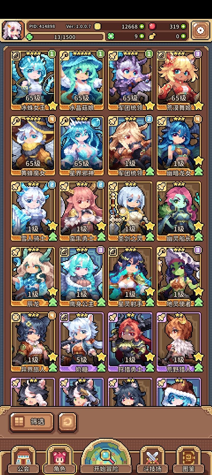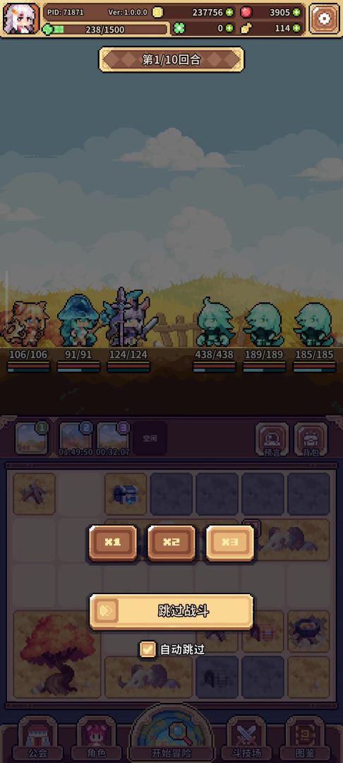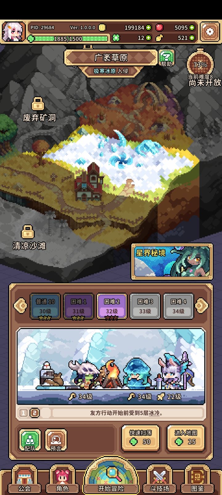 嗯……我想我今天努力一下大概能把全攻略肝完。不讲天赋是因为有佬要讲,我个人也没有很深度的体验天赋(太氪了),所以等其他佬的攻略吧,如果佬很久没做我再做个简洁版的。上地图!老样子,从上往下看。最上面是当前区域的名称,当前所在的区域为广袤草原。下面的“极寒冰原入侵”的意思是这个区域也是活动区域,可以刷到活动装备(目前是冰系装备),活动结束就没有了。右边是活动的计量条,条满了就可以挑战活动关