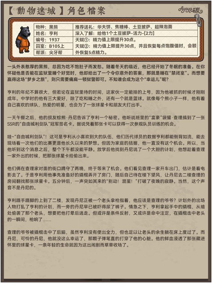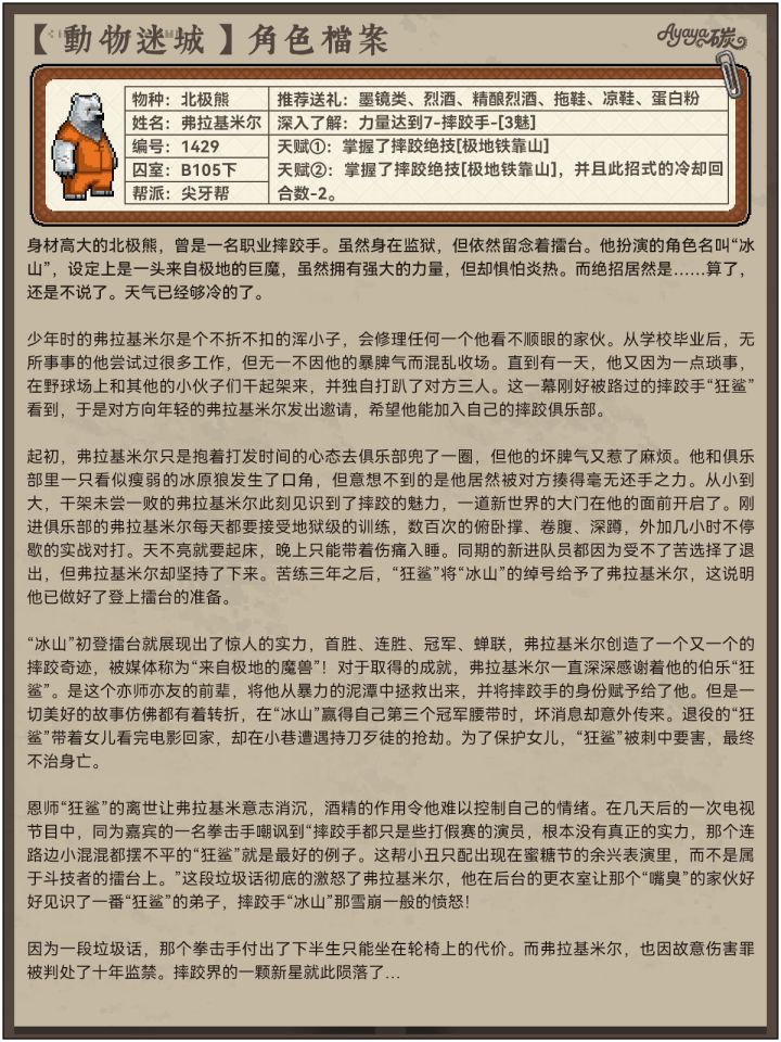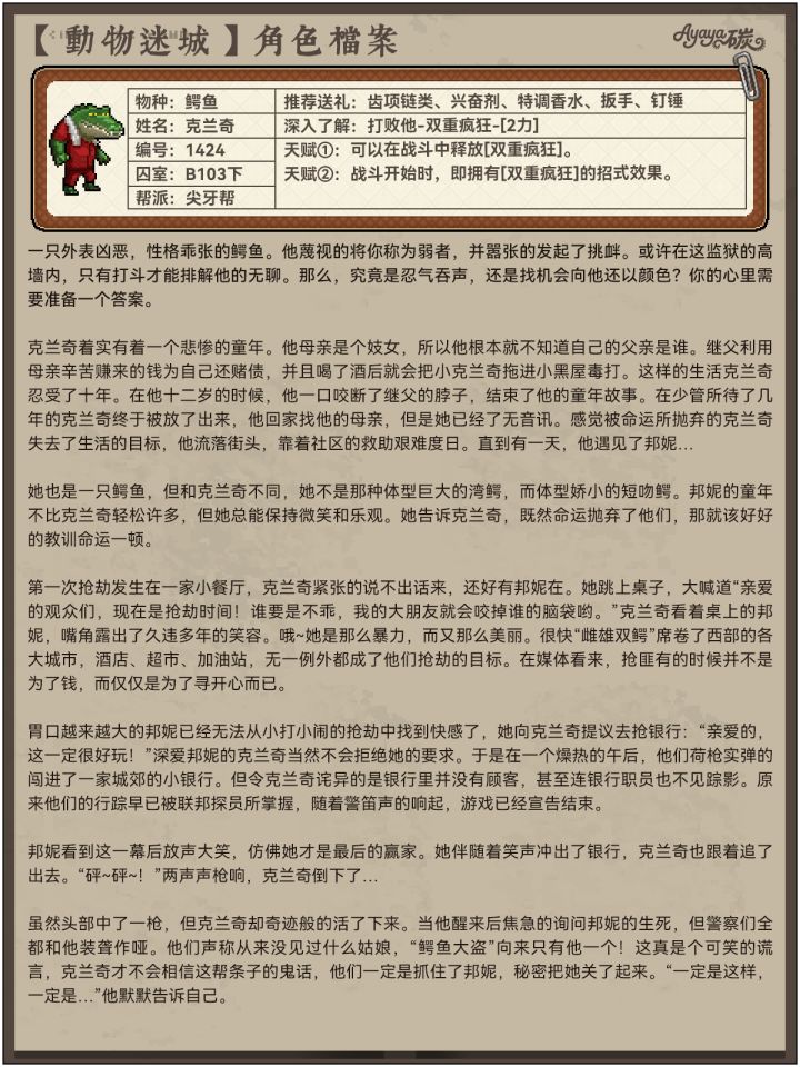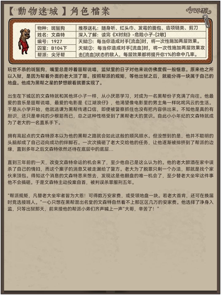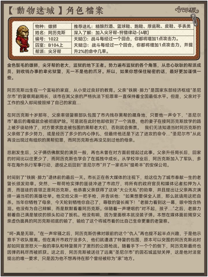 《动物迷城》尖牙帮档案!每个角色背后都有自己的故事!尖牙帮并非刻板的“全员恶人”,他们每个人也都有各自的过往......在游戏中还有更多丰富的细节~这里就不过多展开了啦。尖牙帮成员:雄狮 阿历克斯北极熊 弗拉基米尔鳄鱼 克兰奇黑熊 亨利黑豹 鲍勃斑鬣狗 文森特疣猪 哈库拉#动物迷城 #动物迷城攻略 #今天游戏圈发生了啥 #发现好游戏 #吃瓜爆料 #游戏推荐 #游戏资讯