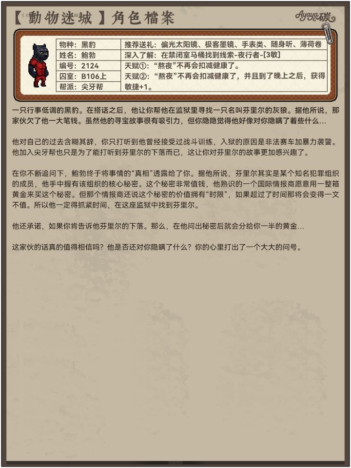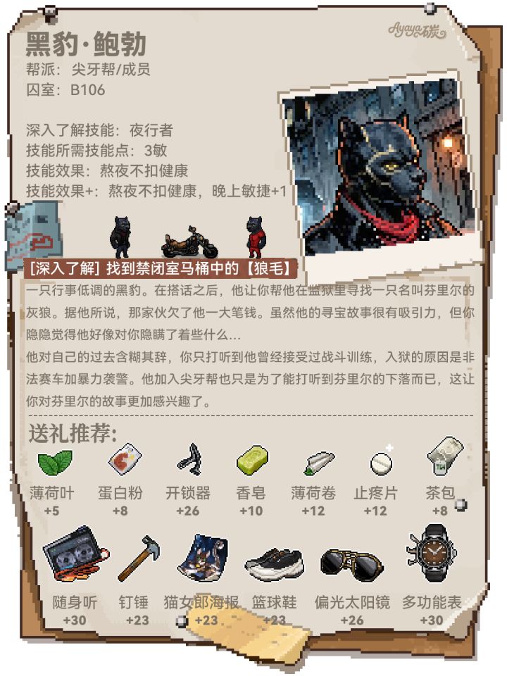 帮派: 尖牙帮/成员囚室:B106深入了解技能:夜行者技能所需技能点:3敏技能效果:熬夜不扣健康技能效果+:熬夜不扣健康,晚上敏捷+1一只行事低调的黑豹。在搭话之后,他让你帮他在监狱里寻找一只名叫芬里尔的灰狼。据他所说,那家伙欠了他一大笔钱。虽然他的寻宝故事很有吸引力,但你隐隐觉得他好像对你隐瞒了着些什么…他对自己的过去含糊其辞,你只打听到他曾经接受过战斗训练,入狱的原因是非法赛车加
