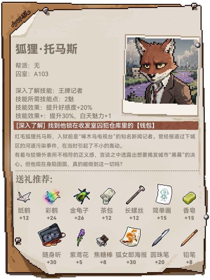 帮派:无囚室:A103深入了解技能:王牌记者技能所需技能点:2魅技能效果:提升好感度+20%技能效果+:提升30%,白天魅力+1[深入了解] 找到他锁在收发室囚犯仓库里的【钱包】送礼推荐:纸鹤/彩鹤/金龟子/茶包/长螺丝/简单画/香皂/随身听/狐女郎海报#动物迷城 #动物迷城攻略 #pc游戏攻略评测 #游戏种草计划 #发现好游戏