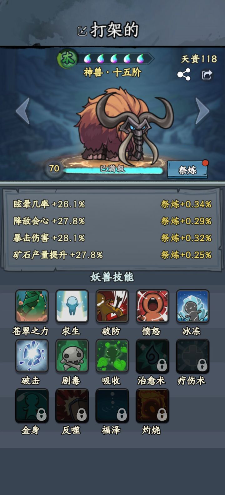 UID:20206359给70分吧属性三条眩晕和暴击伤害还可以,不过只能PVP有点用,后面还是要搞命中,暴击和爆伤。经济词条就算了,后面大小弄个经验出来。技能大差不差,反正以后都要重新洗,理论上剧毒换个灼烧就行了,不过洗只能属性和技能一起。给官方的修改建议:1、属性和技能可以分开洗,降低重复操作次数,成本可以适当增加2、技能效果设计的丰富一些,平衡一些,让大家体验一下不一样的妖兽,也可