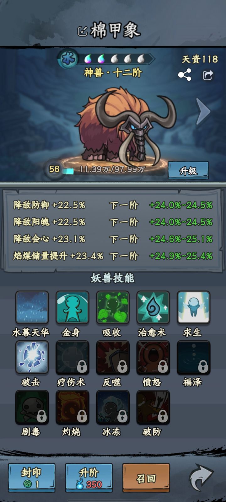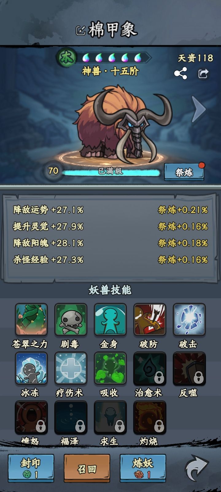 洗了几次的棉甲象,前期挂机专用 ,因为上面有经验加成,下面少了个重要的求生技能,所以要减少20分,因为是前期就先用着,所这只棉甲象只能够给60分,因为是前期我觉得应该给80分!等以后资源够了再洗第二只宠,游戏里战斗宠洗炼是上面属性和下面的技能一在洗的,如果没有足够的资源,我建议新手前期上面洗到有经验加成,下面技能洗到有破击和吸收和金身就免强可以用了,因为是前期,新手资源少,土豪除外,都不用追求完美