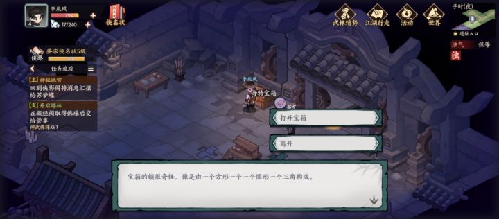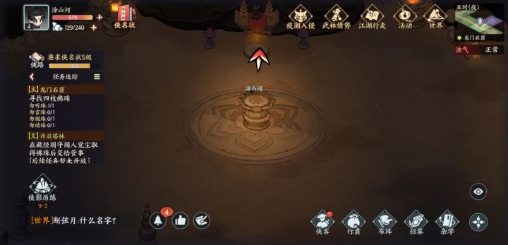 在进行龙门窟任务时,第一次触发莲花台机关,收集1颗珠子后退出。再次进入游戏,莲花台机关无法触发,后面3颗珠子收集不到,任务卡住。