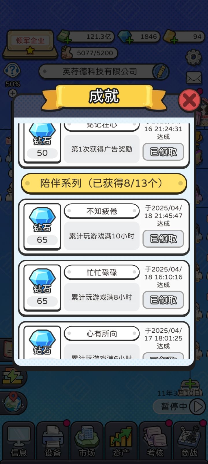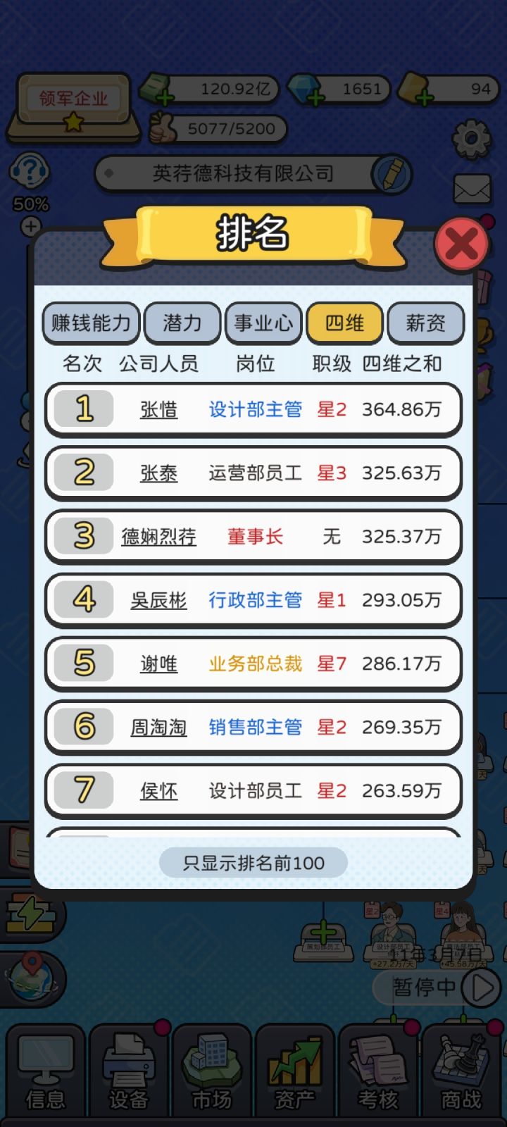 1.实在缺钻可以用时间大法,离线和七天签到可以反复领,几分钟就能刷几千钻,想慢慢体验游戏的可以不用。2.潜力不重要,加的赚钱能力是毛毛雨。事业心不重要,速刷星级以后不需要工作经验。学历不重要,因为没啥用。薪资不重要,不管多少工资公司都是赚钱的。设备市场考核都不重要。 职级⭐⭐⭐最重要,职级上去了,赚钱能力和四维都是指数级的涨。3.读书是涨四维最快的,职级越高,加的越多,星级员工读书看广告全红