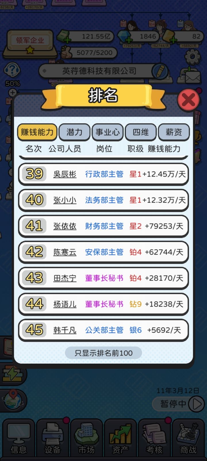 少养点人,我个人推荐就主要养业务部门下,人数到40左右就OK,前期还可以卡一下18人什么的,其它部门就出一个头头好了。金币只强化业务部,不用看广告,金币很快就完全没用了;钻石由于基本不招人,也不用刷属性,考核和市场开到能把手头的人全装下去就行,由于压了总人数,并不需要开太多,大部分时间刷商战就够用,偶尔只看看来救急;金卡成了全场MVP,多看,爱看,喂大毋须多宴。如果要对公司等级比较有追求,