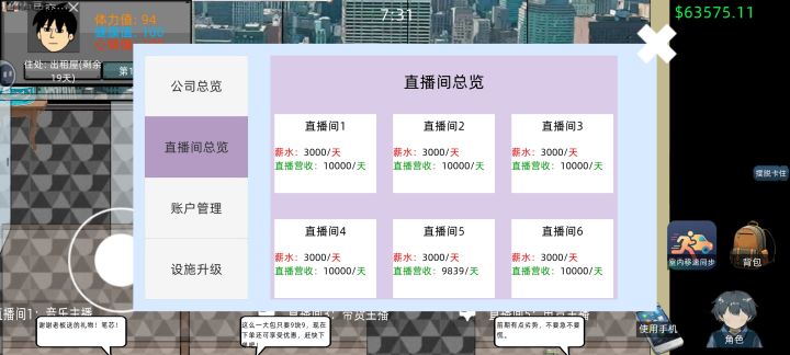 把把所有主播升满级之后,每个主播一天可以赚7000块。6个主播就是42000。但是我睡了一天之后发现增长的金额是不到2万。