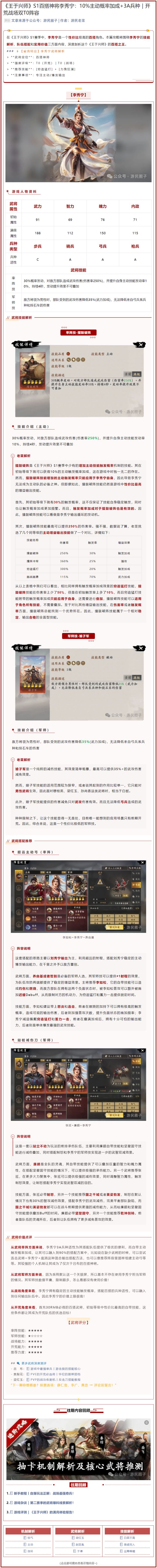 ——大家好,这里是柚子Lab,一个用数据说话的硬核游戏研究室。前言: 前面两期,我们分析了王于兴师S1赛季中各个将领的武力、智力、魄力、政治及四维等基础属性值的排名,往期链接详见文末。 不过在基础属性之外,影响将领作战能力的另外一个非常重要的因素就是将领的“兵种适性”。这一期我们一起来研究一下王于兴师里的各个将领的兵种适性,以及探索一下官方是如何通过“适性”来设计和定位每个武将的角色的吧