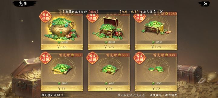 我是一个328党,玩了几天感觉游戏还是可以的。建议:1.策划是不是把月卡弄错了???68元和30元??把兄弟们当日本人了??而且68比30元多花一倍钱,每天多30金珠?2.征战这个东西删除了吧,改成一键扫荡的福利吧,确实没必要,这么累。3.我是一个资深slg游戏玩家,如果平民玩不下去游戏凉凉很快,请参考隔壁谋帝国。 操作头像能来一个设置大小功能吗?还有很多建议,希望策划能看到,多多吸取玩家
