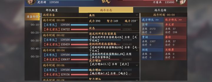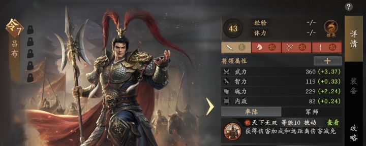 吕布面板武力360,演武里吕布队作为防守方,武力变成了390,比面板多了30,智力魄力也是同样多30。奇怪的是进攻方的武将属性没变化