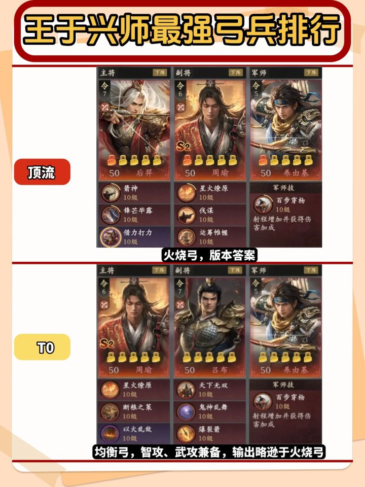 目前最强的弓兵还是后羿周瑜的火烧弓,然后是周瑜吕布的均衡弓,伤害略逊些最后就是赵云闪避弓,适合弓兵对射顺便提一嘴,王于兴师国际服已经上线,有没有一起组队征战的