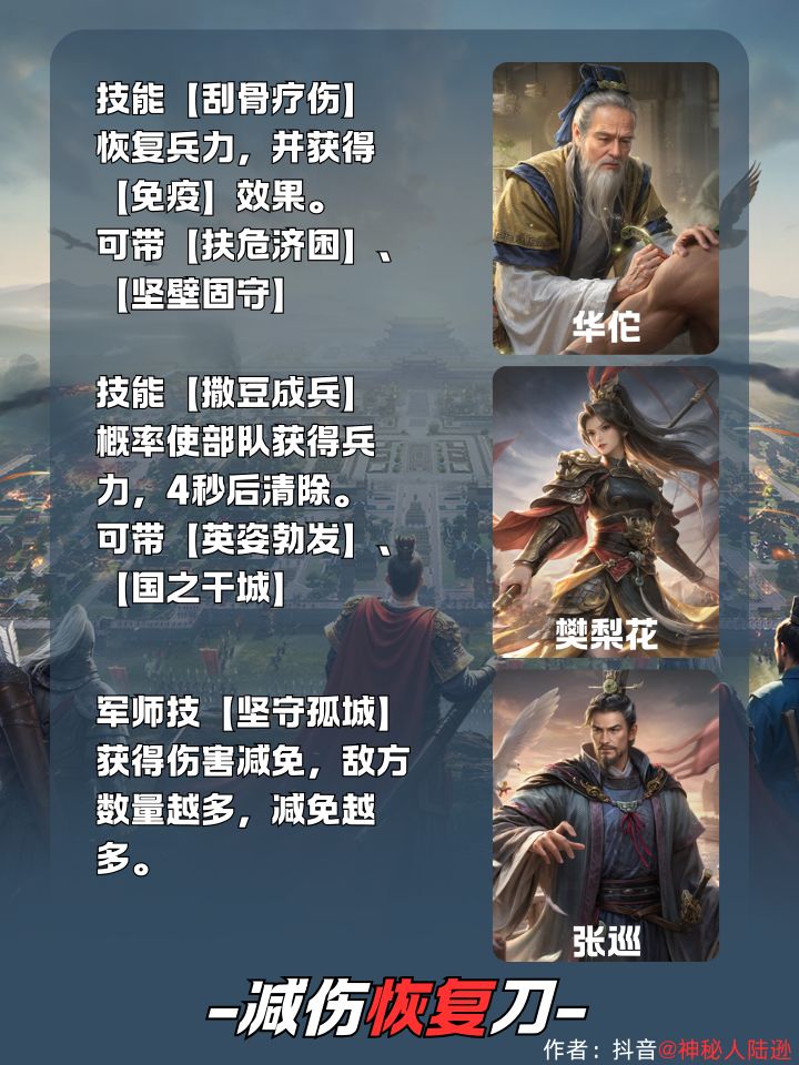 这个魄力加成是什么意思?把魄力按公式换算成百分比再加到技能初始百分比上面吗?比如这儿受到伤害降低0.5%,如果魄力算出来再降2%,所以总共就降2.5%,是这样加成的吗?别人打了100点伤害,所以我受到100*(1-2.5%)=97.5点伤害是吗?另外扁鹊这个恢复百分比都超过100%,这个又怎么理解呢?恢复的数量比伤兵的数量还多?那如果触发的概率够高的话兵越打越多吗?感觉怎么理解都凑不到一块儿去