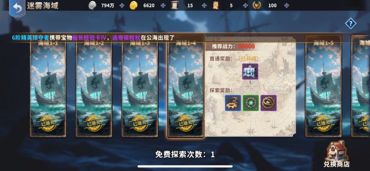 4.29更新版本现在6船可以去迷雾之海 开启核心功能,本人仔细研究了一下,给新人朋友指导!1.现在版本迷雾之海的关卡之间跨度很大,可能你前面能打过Boss,后面一关估计能小怪都打不过!现在我也是打过1-6,卡1-7,双6船6.5万战力经常精英小怪都打不过!精英小怪图1,绿色怪,双船,平均战力是你看见战力除2,基本战力没他一半,很难打!(基本平民打不过)2.现在方法是不要极限冲关,因为每关的