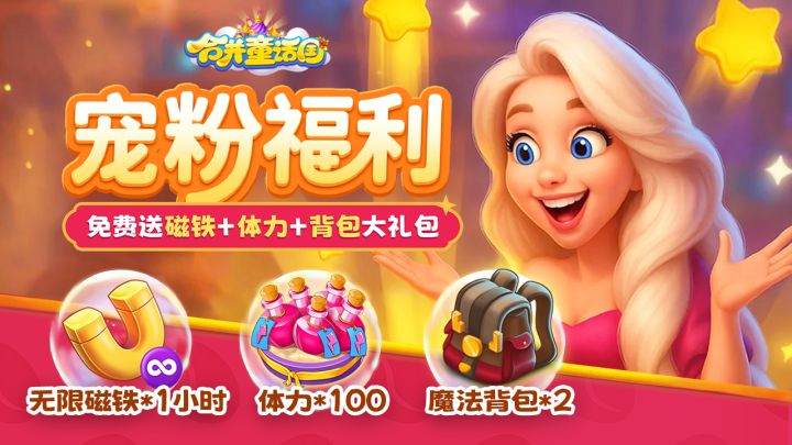 【宠粉福利】来了!!吐槽体力不够,收拾物品太烦、没地方放宝贝的冒险家们,小童连夜申请了福利,简单直接解决大家的困扰!-活动时间:7.9-7.11 活动参与:奖励内容:无限磁铁*1小时,体力*100,魔法背包*2 福利多多,人人有份~~冲冲冲鸭!!#发现好游戏 #合并童话国 #游戏日常 #游戏福利