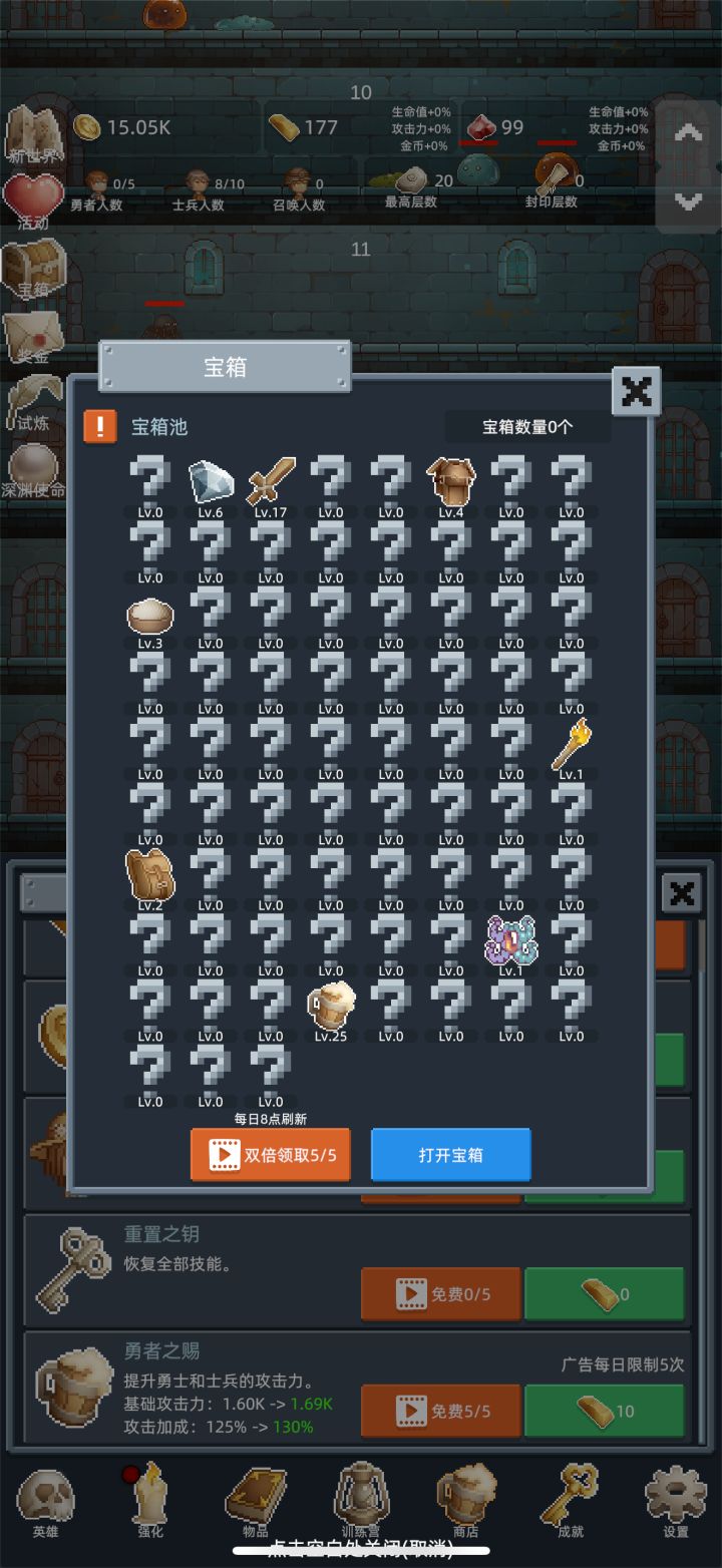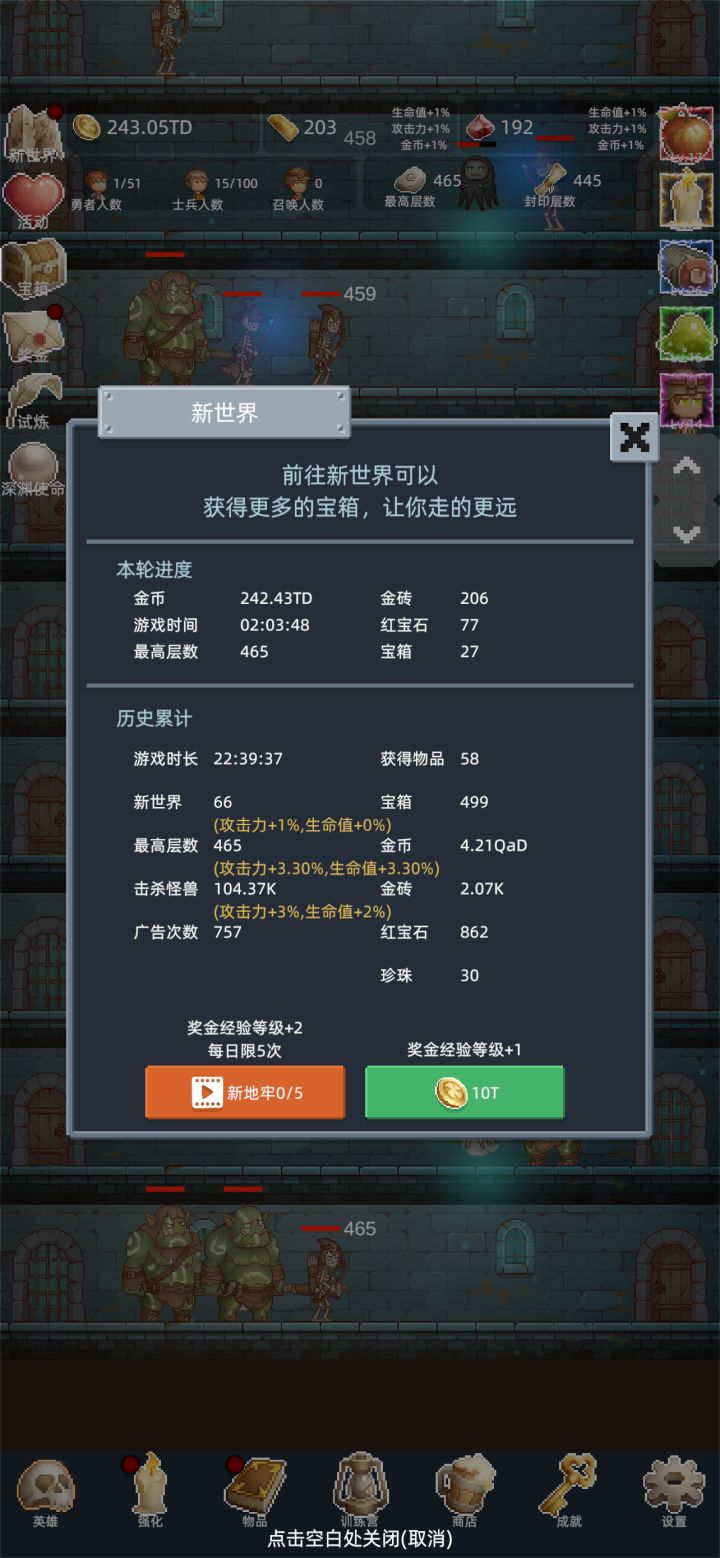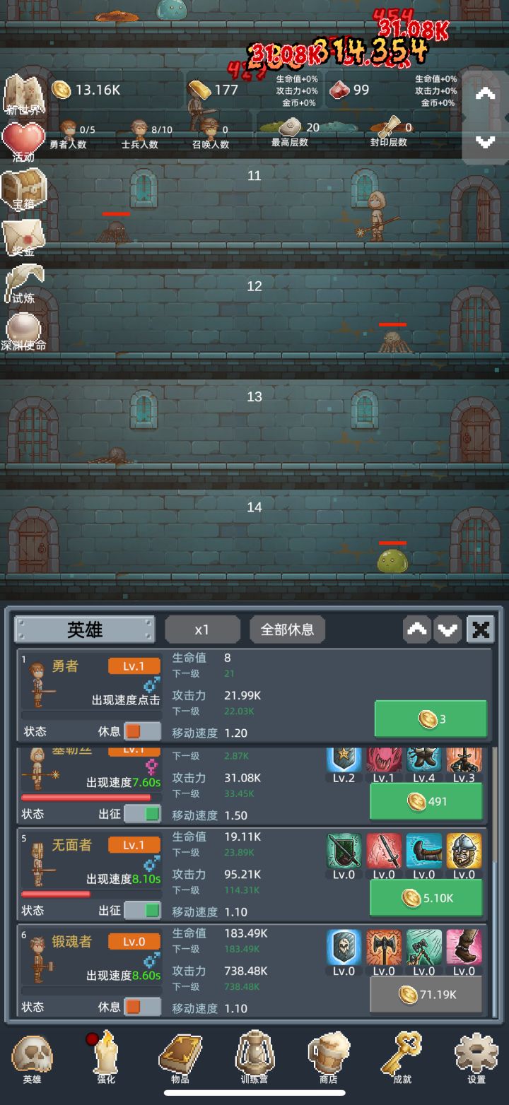 在前3次重生前不需要特意升级勇者,开新佣兵推层更快,佣兵可以适当升级,只要升级花费的金币不超过开新佣兵的十分之一就行。商店加属性的酒买满,其他的冲关时候才建议买。转生三次后争取刷到150层,之后的每次重生都会开启试炼,在限定的时间内推到目标层数,会有不少奖励。每个10的倍数层都有几率刷出宝箱,前期就是不停的重生试炼刷宝箱,商店的东西除了加属性的酒,其他的每次重生都会刷新,白玲推层很强,搭配强化