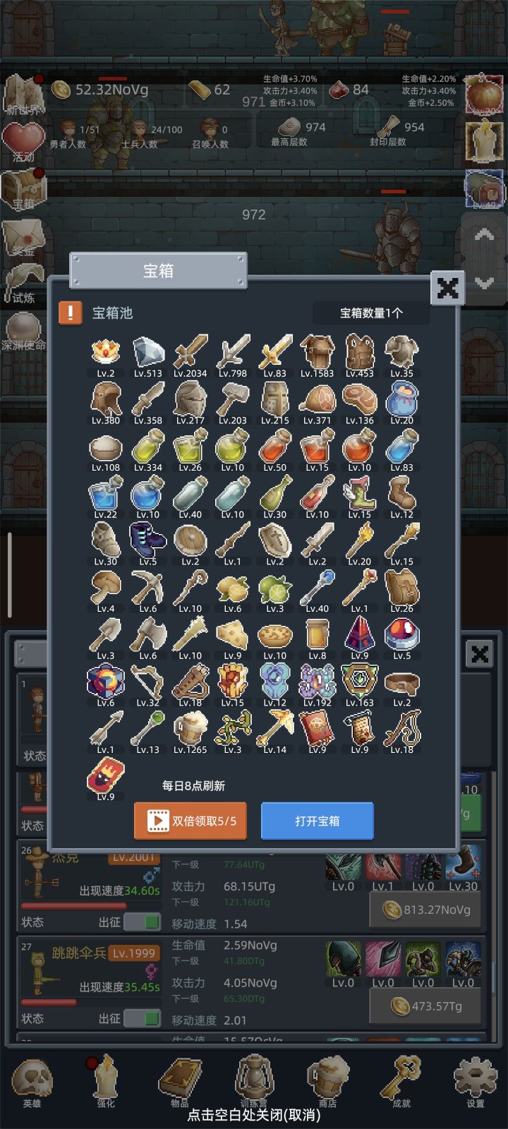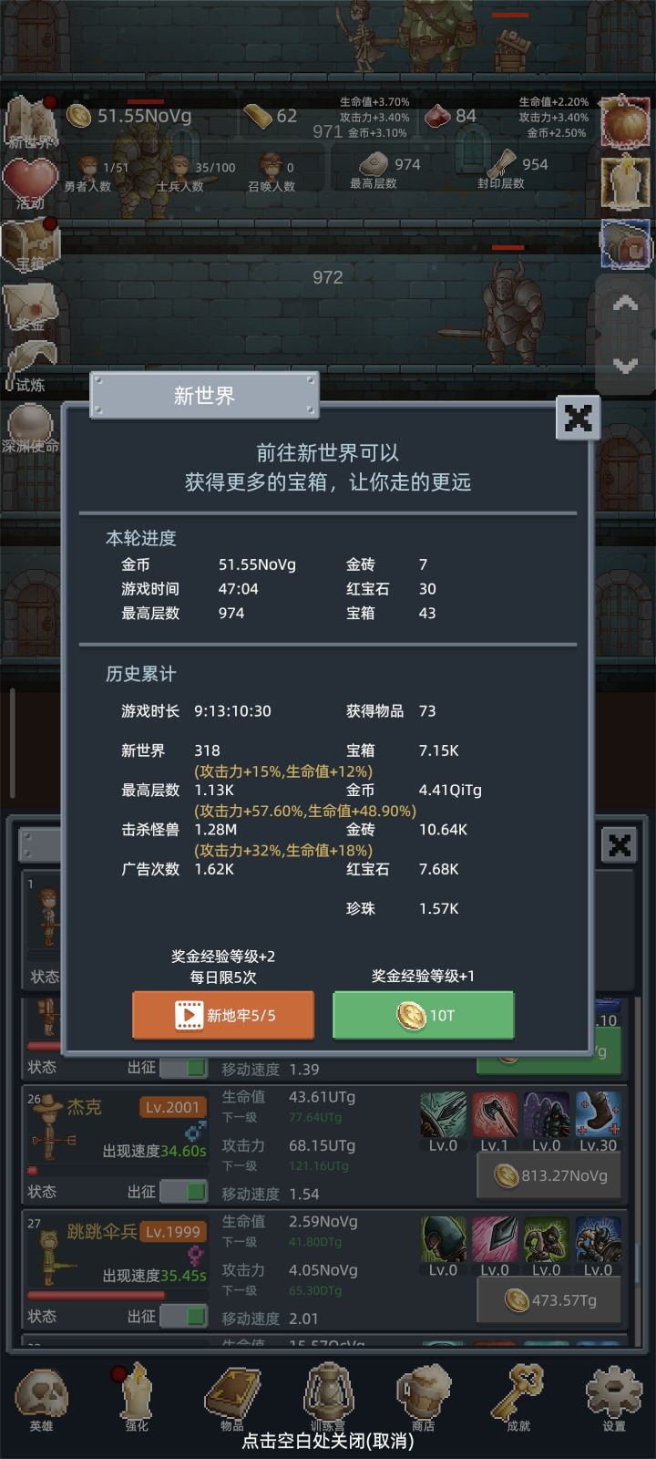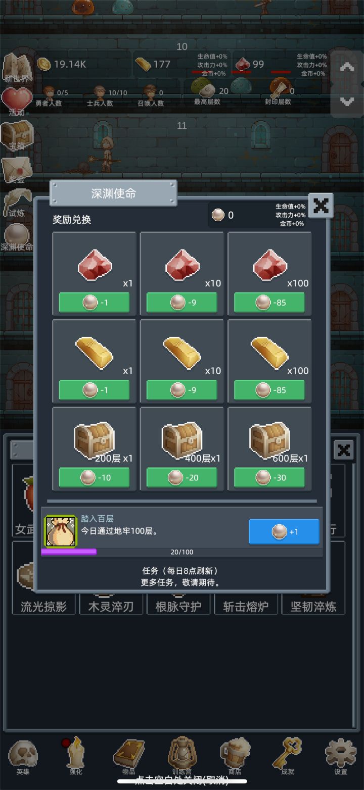 在前3次重生前不需要特意升级勇者,开新佣兵推层更快,佣兵可以适当升级,只要升级花费的金币不超过开新佣兵的十分之一就行。商店加属性的酒买满,其他的冲关时候才建议买。转生三次后争取刷到150层,之后的每次重生都会开启试炼,在限定的时间内推到目标层数,会有不少奖励。每个10的倍数层都有几率刷出宝箱,前期就是不停的重生试炼刷宝箱,商店的东西除了加属性的酒,其他的每次重生都会刷新,白玲推层很强,搭配强化
