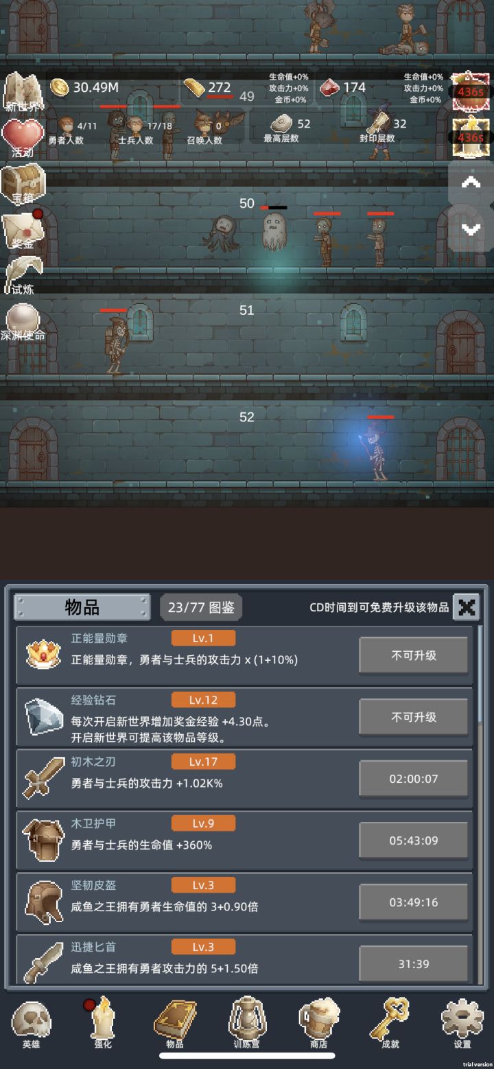 在前3次重生前不需要特意升级勇者,开新佣兵推层更快,佣兵可以适当升级,只要升级花费的金币不超过开新佣兵的十分之一就行。商店加属性的酒买满,其他的冲关时候才建议买。转生三次后争取刷到150层,之后的每次重生都会开启试炼,在限定的时间内推到目标层数,会有不少奖励。每个10的倍数层都有几率刷出宝箱,前期就是不停的重生试炼刷宝箱,商店的东西除了加属性的酒,其他的每次重生都会刷新,白玲推层很强,搭配强化