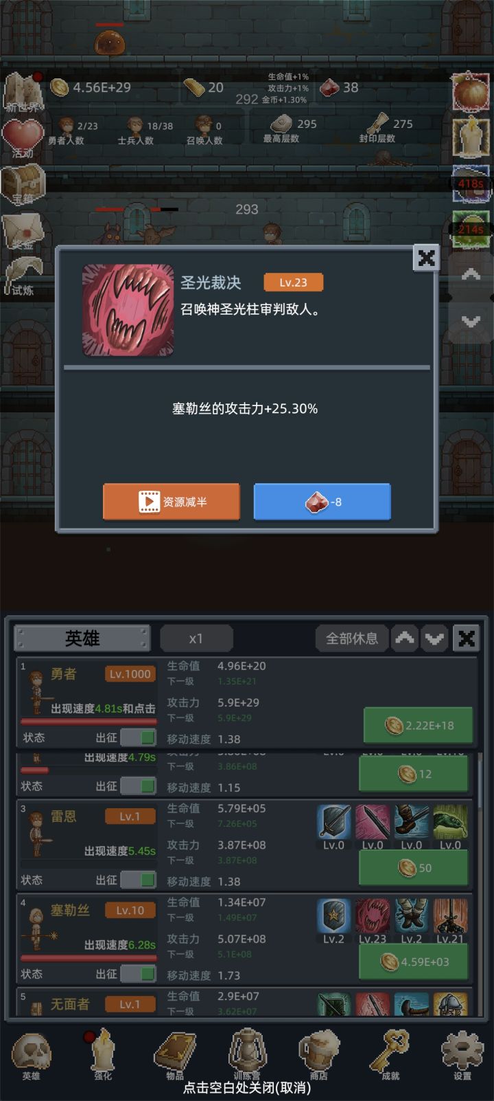 勇者和士兵的人数强化到20人左右就差不多够用了,点高了也塞不满