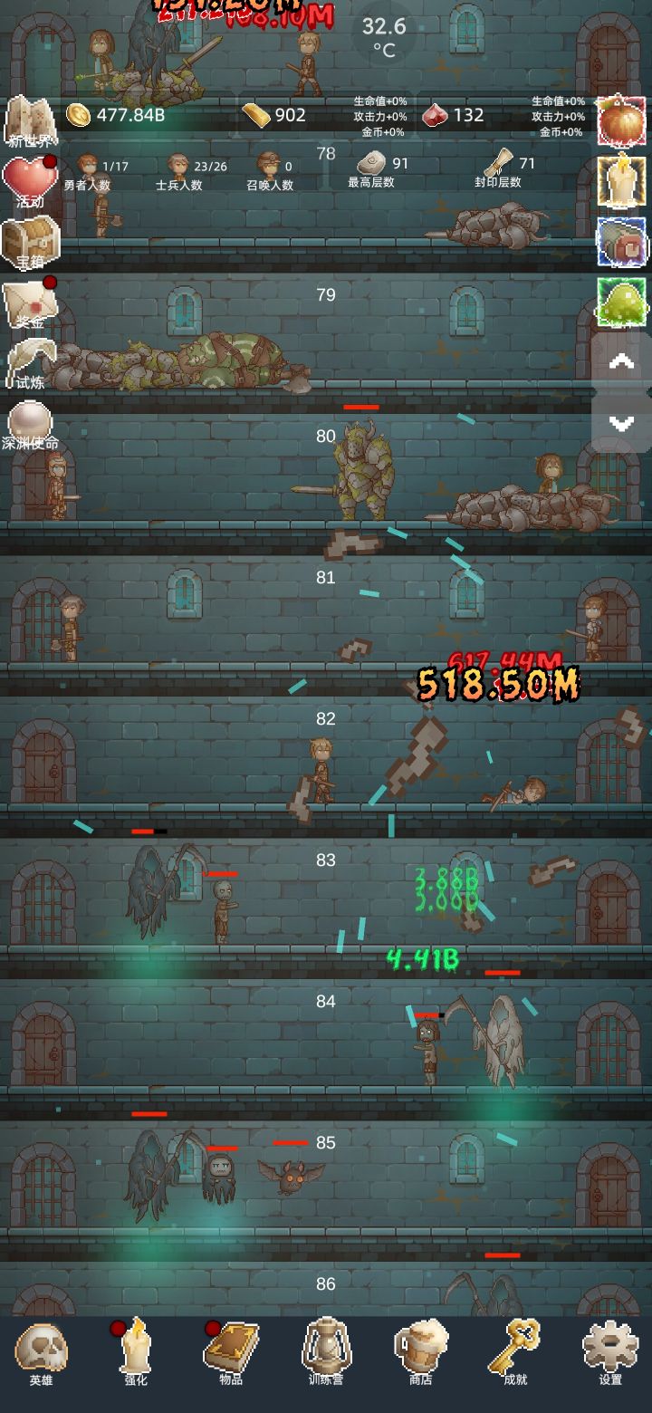 新手不要急着推层,游戏中的重要资源金砖和红宝石的获取都要依靠刷200层以内的试炼 先在100层转生3次左右再尝试突破150层 突破150层开启试炼后继续在100层快速转生,实力足够了就速刷200层拿试炼奖励 刷的过程中可以尝试突破400和600两个关键层 卡的太久就转生继续刷200层试炼 推到高层拿的珍珠可以拿来换红宝石,但是实际上不如多刷几次试炼拿的红宝石多
