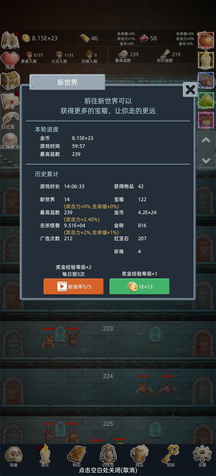 如题,玩了两天,转了14次新世界,前期因为没有宝箱道具建议第一天玩的时候,前3-4次转世在100层~120层左右,因为有些道具是有层数要求的,否则只能拿到基础道具。第4-5次,就努力争取一下150层转,开试炼,因为试炼是金砖,红宝石的主要来源,早开早享受。5-10次的转世,就150层~180层转,一样卡层数道具,如果不清楚具体层数可以去点开宝箱里面有具体层数。10次~15次转世,就可以20