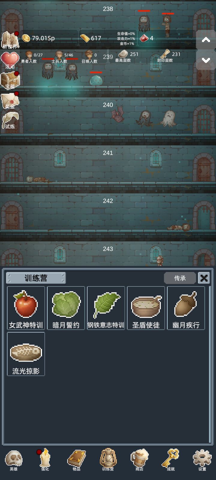 新人进群首看群公告,兑换码搞一搞,tap上分享3次游戏动态-截图私聊群助理,会给你三个正能量兑换码,然后新世界4转再赠送一级,满级。 前期金钻商店买最下面的勇者之赐,每次转生必买!!!玩法首次爬关100关,金币10T开启新世界(也就是转生),10T金币比较困难,大概在105关时候,商店点金术单位T时候看广告,加速