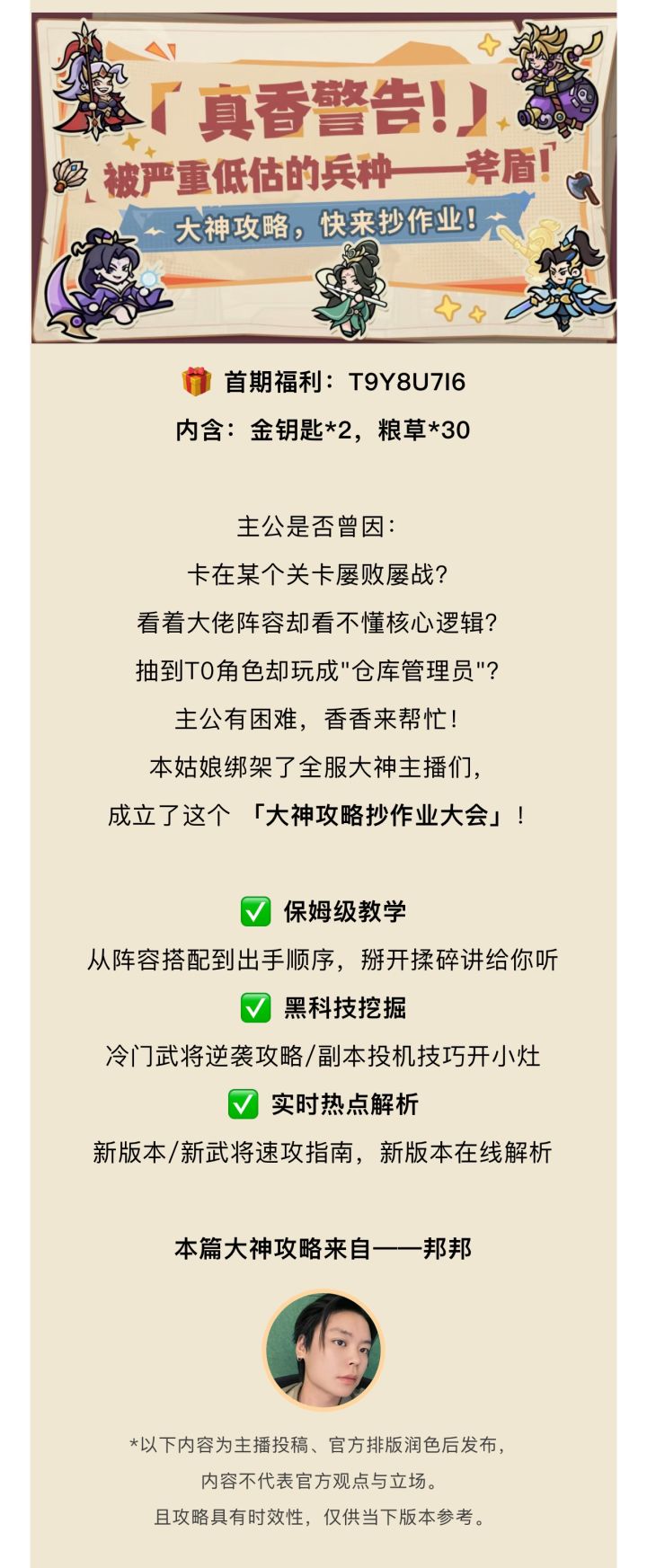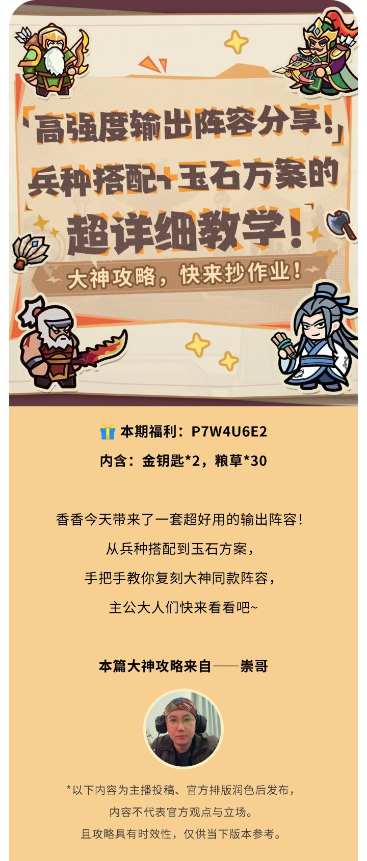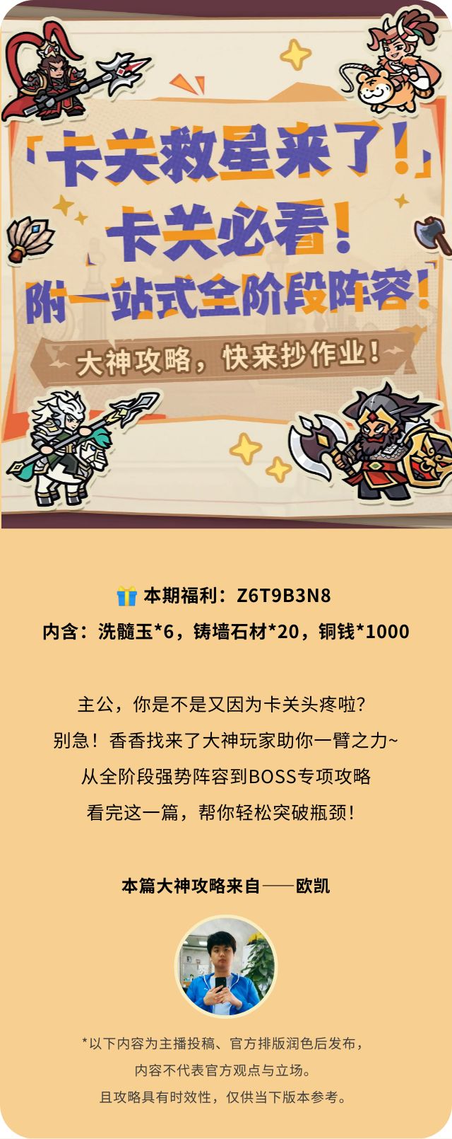 🎁 本期福利:E4R5T6Y7内含:粮草*50,铜钱*1000主公是否在为配队阵容迷茫,或为后期转型乏力而焦虑?攻略太长不看?阵容太多挑花眼?恭喜主公,看到这篇就够了!