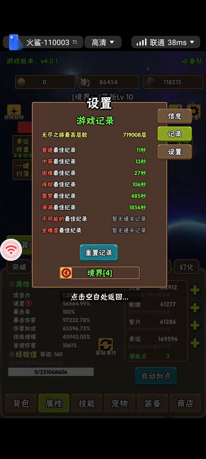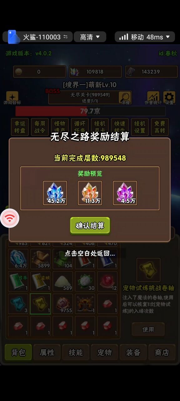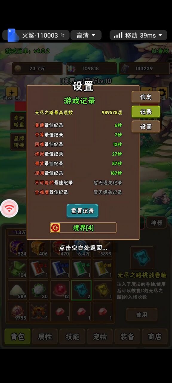 境四有个无尽跳关神器,一次跳10层,加快进度,减少无用的打层时间但是有些喜欢特别数字,或者有点小强迫症的玩家就比较烦恼,因为弄不到喜欢的数字了,例如:666666 777777 888888 999999 1234567之类的我这两天打层数的时候发现,如果跳关几次后点结算,尾数就会变,这样我们就可以通过多打几次,跳关后点左下角结算奖励看看尾数是不是想要的,是的话就可以结算,不是的话就继续打