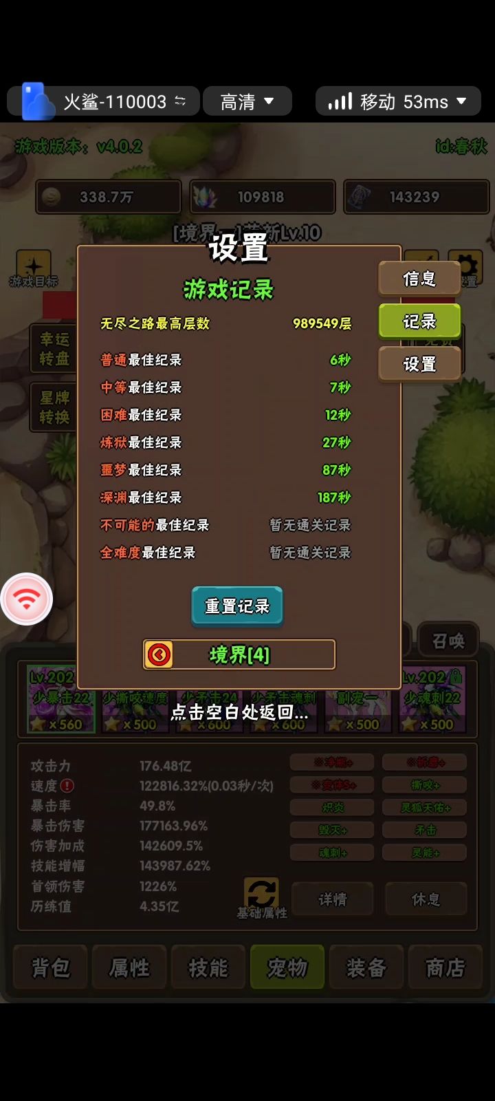 先说个人观点:还是和之前先拉1-2个600+6000会好一些本来境四出了,看到需要的资源太多了,短时间内懵了就想着摆烂,另一方面是想着把境三没有弄满的宠物和进阶补补再说,咸鱼慢慢沉淀。这是三节同庆刚好双倍副本才开始升星600,升了第一只和第二只后,试炼和刷图记录确实明显提高,第三只还在路上,但是提升不是很大。因为不是定制宠物,技能会有差别,而且不同副本宠物用的不同,基本上伤害高的,就是两只或