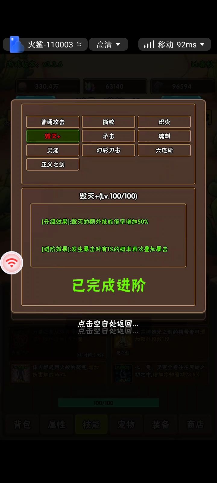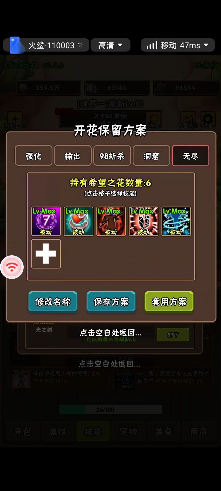 在刷境三不可能称号,或者刚进境四,打100星记录的时候,伤害不够,但是又需要来回切换开花技能,会用到斩杀这个技能。有些玩家是用自动精灵识别,有些是自己手动切换,可以参考一下大概位置,方便切换开花方案我们可以打开技能,如图所示的界面,这时候背景可以看到怪物血量,在血量达到箭头所指,下面的装备两个字中间,偏向“装”,就可以触发斩杀了