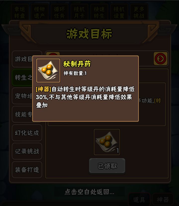 前提:拥有游戏目标转生一千次记录的神器 秘制丹药(减少自动转生时30%的等级丹消耗),通用天赋60级开局拥有金币等级,自动转生打开自动购买金币选项,解锁境2且境2普通常态能打到极限记录,升级增加普通牌子获取的神器3.3.4版本前理论:转生一轮增加4牌子也就是4*5 20个等级丹 一轮升75级消耗21个等级丹 21-20 消耗1等级丹 靠开遗产弥补并增加这部分等级丹3.3.4版本理论:与前理论一