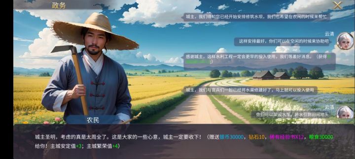 话不多说,直接上干货!1.种子为什么发霉选择4:粮库种子为什么发霉,我定要查清楚;第二次对话选择“处罚留任”。可获得:中级经验书10,中级经验书15,银币3万、钻石10、稀有经验书12、粮食4万、安定值+5、繁荣值+3。2.难民要不要入城选择1:既然这样,放他们入城吧。可获得:中级经验书10,银币1万、木材2万、安定值+1、繁荣值+4。选择2:暂且安排他们到城外临时驻地。可获得:中