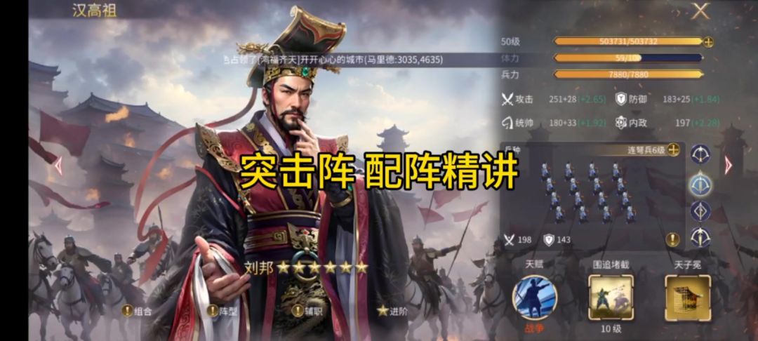 “决定战斗胜败的因素很多,包括英雄等级、星级、红度、技能等级、兵种等级、卷轴、自由天赋、特殊资源加成、防守加成、甚至还有地形和奇迹加成等……” 突击阵算是我最喜欢的阵型之一,相比与其他后切型阵型,例如狼群、奇袭、空城等,我更喜欢突击阵,因为突击阵兼顾看后切的输出能力和大营的生存能力,根本原因在于六星英雄汉高祖刘邦,在现有阶段,也只有刘邦拥有突击阵型,物以稀为贵,这足以说明突击阵的价值! 首先我