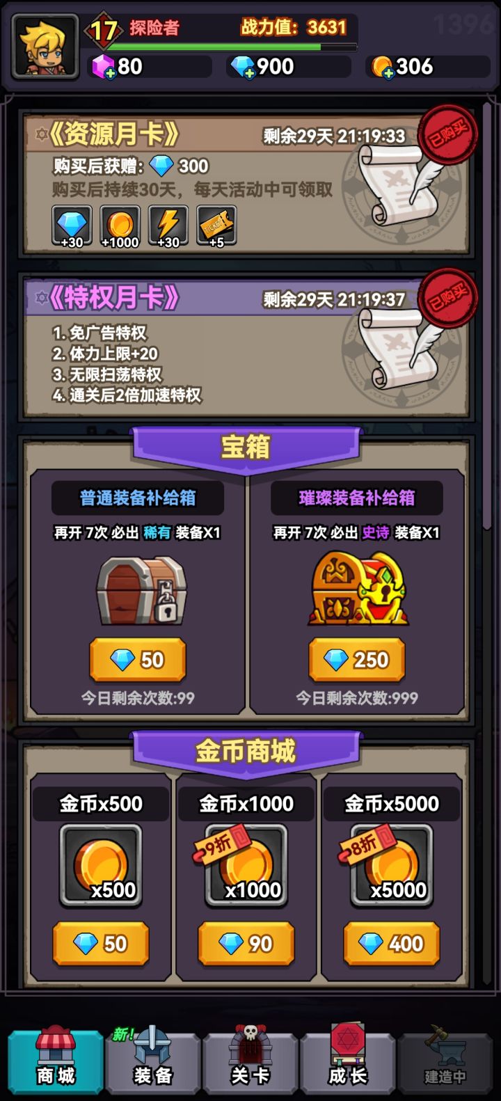 1.宝箱购买指南宝箱分普通和璀璨两种,每日首次都能看视频免费开,必开不亏。普通宝箱最高能出绝世装备;璀璨宝箱最高能出神话装备(最高品质),但璀璨宝箱价格更高,前期性价比较低低,前期优先开普通宝箱。宝箱有保底机制,长期坚持开,迟早能出高品装备,不用急着氪金。此外,宝箱有时会出现限时折扣,要时刻关注官方动向,该出手时就出手。2.金币购买与使用商城金币每日免费 1 次 + 看视频 3 次,必领满
