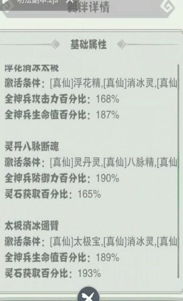 这次更新了羁绊系统,种类繁多各类搭配都有。在洗羁绊的时候要注意,宝箱开启数量选择1。不用去在意属性和品质。然后【是否覆盖名称】在洗的时候勾选,羁绊成型后把沟去掉!!!这里重中之重一定要注意!!!羁绊加成属性还是非常可观的,还有灵石和灵气加成。到了50轮后灵气十分重要为大伙提供一套羁绊搭配,洗的时候只要名字相同就行。哪个部位不重要浮花精消冰灵太极宝八脉精断魂鬼通臂鬼灵丹灵
