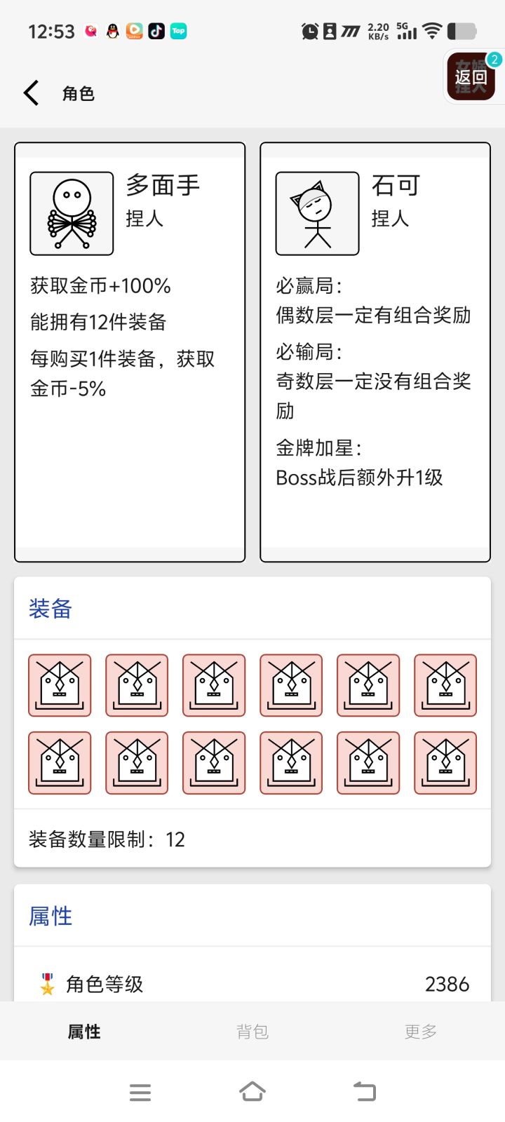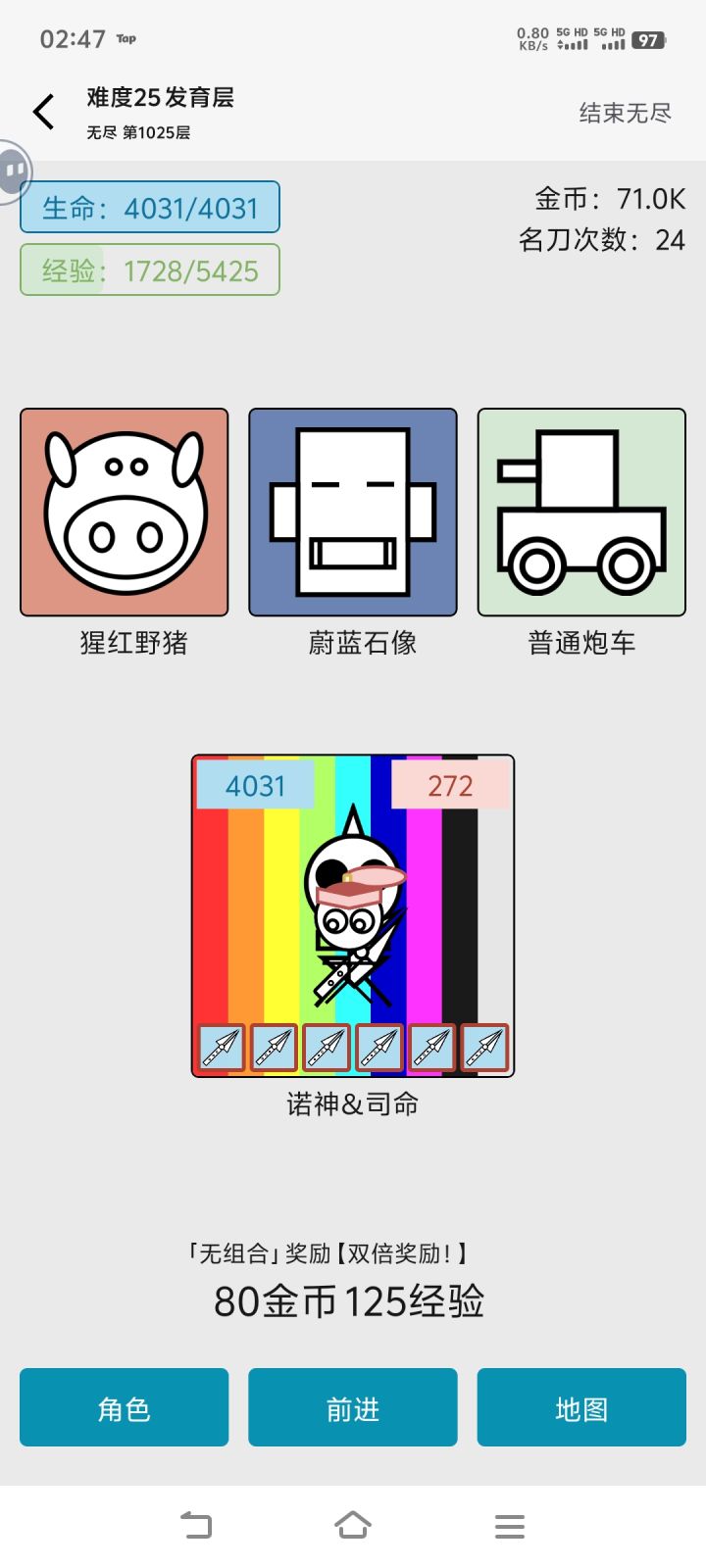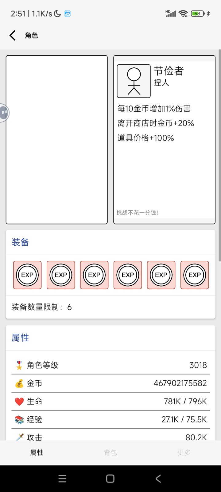 我玩的是作者提供的网盘版本,选择的是融合模式富翁开局万亿元资产,节俭者每10元获得1%伤害加成,开局即有10亿倍增伤,奠定了无脑过25的基础离开商店后,总资产+20%(这个效果简直逆天,利滚利)这也代表着这个组合的增伤倍率也会指数级提升!碰到怪就是秒,可以说相当无脑游戏中除角色效果外提升战力的方式有两种:角色升级后加成4选1或者商店,先别急,虽然富翁让我们获得了用不完的金币,但我不推荐在