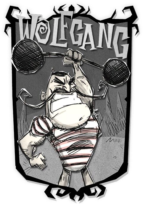 "Mind says no. Muscles say yes!"“脑袋说不行,肌肉却很诚实。”– 沃尔夫冈沃尔夫冈(Wolfgang)是饥荒中第二个可以解锁的角色,解锁条件为 320 点经验值,且为多人版饥荒中可以游玩的 12 个角色之一。他是个对自己的力气很自满、心思单纯的大力士。虽然他的台词很简单又常常出现错误,有可能是在暗示他不太聪明,但也可以视为他在学习第二种语言。当他的饥饿值较高时