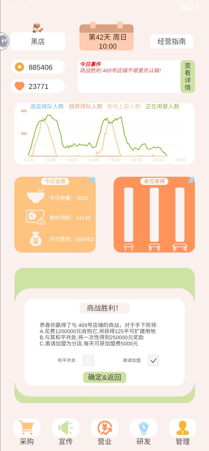 首先要表扬一下官方,为什么我会再来写这个评价呢,因为游戏更新真的很频繁,有在听取玩家反馈建议。那么废话少说,说下这次游玩的体验 还是这个折线图的问题,上次玩了那么久没发现,这次我觉得我终于是看懂了,可以看我的视频里,这个折线图的显示应该是不完整的,他跟随正在用餐人数的最高点,导致其他几条数值曲线都显示在x轴线上,其实应该是在更下方,看不见所以让人很蒙圈,然后那个柱状图应该是小桌,中桌,大桌的使用情