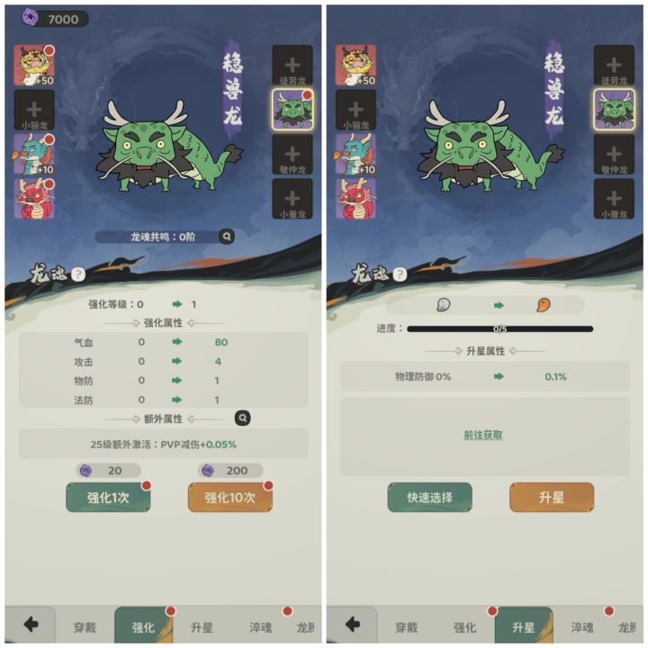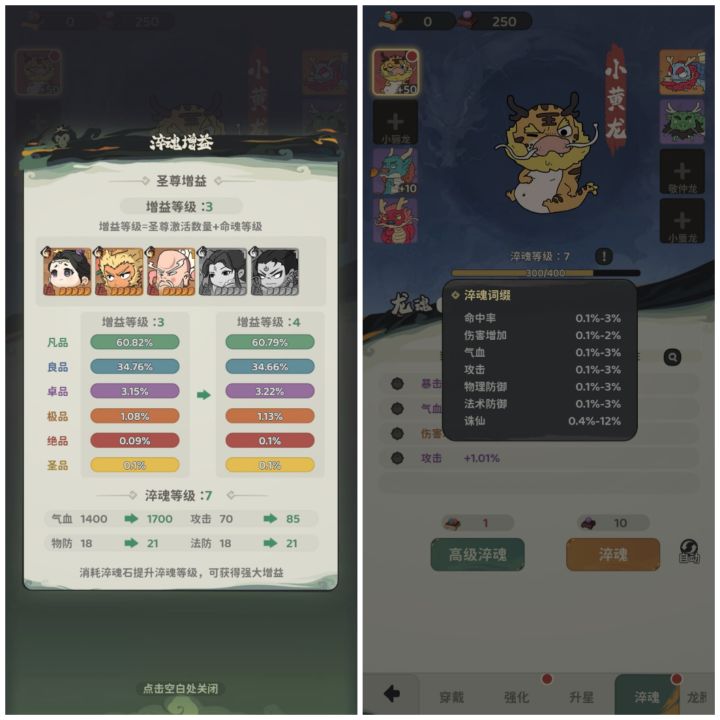 #召唤神龙大赛 一、龙魂提升战力很大,红色带字的最好(能从图1看到)。目前抽龙魂纯看人品,没有专属活动,氪佬实力发挥不出来,是人品为王的竞技场二、龙魂套装类似法宝共鸣,增加额外属性。龙魂强化类似装备强化,龙魂升星类似武将升星,龙魂品质越高每次升星属性增长幅度越大。三、淬魂可以洗龙魂属性词条,只有红色品质以上龙魂能洗,圣尊激活数量和转数能影响洗出高品质词条概率,以增益100计算,