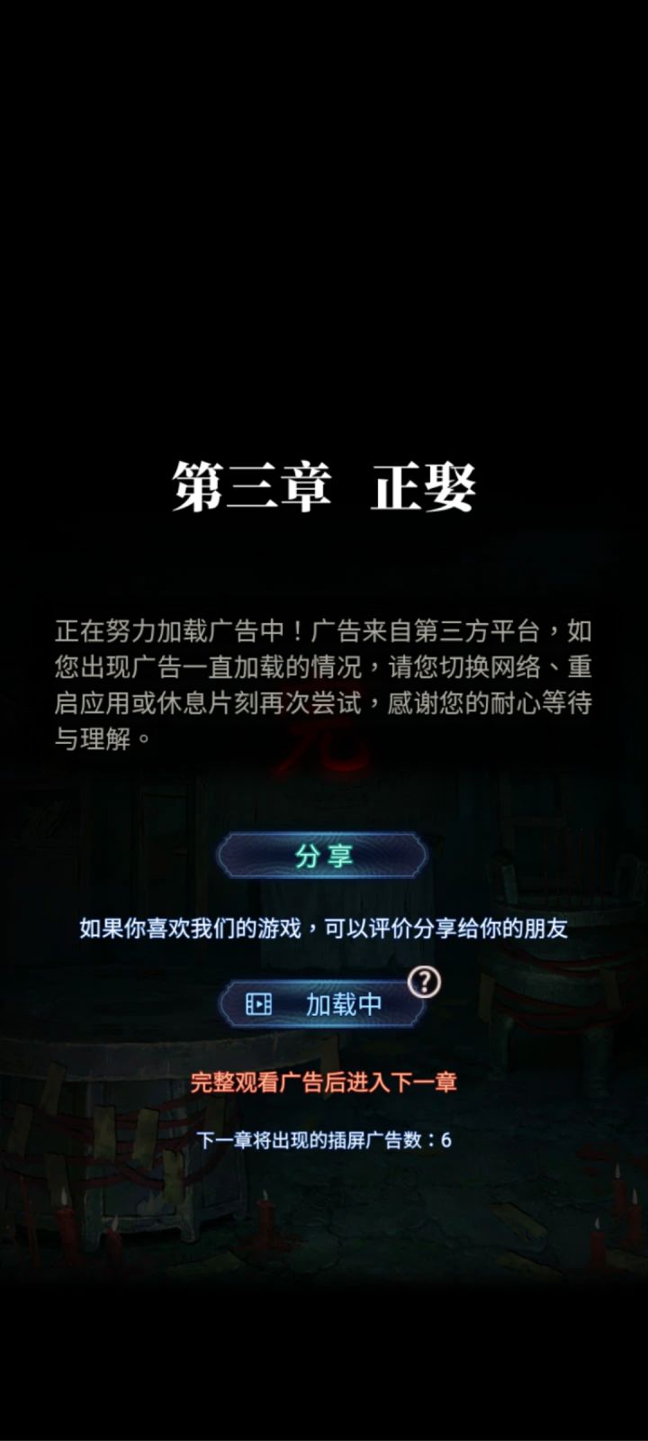 已经从昨晚一直尝试各种方法加载广告了,换网大退重新开机……还是加载不出来。这个也没办法氪金去除广告,可是好不容易都打到第三章了又不想重新玩。有没有大佬可以支个招?或者官方如果看到能麻烦帮忙解决吗?#纸嫁衣8千子树